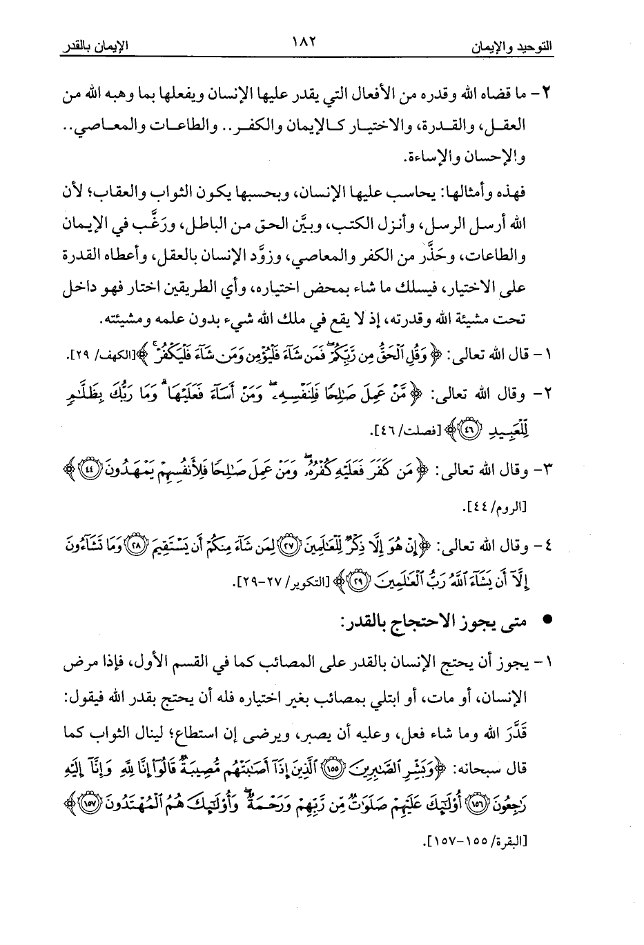 فهذه وأمثالها: يحاسب عليها الإنسان، وبحسبها يكون الثواب والعقاب؛ لأن الله أرسل الرسل، وأنزل الكتب، وبيَّن الحق من الباطل، ورَغَّب في الإيمان والطاعات، وحَذَّر من الكفر والمعاصي، وزوَّد الإنسان بالعقل، وأعطاه القدرة على الاختيار، فيسلك ما شاء بمحض اختياره، وأي الطريقين اختار فهو داخل تحت مشيئة الله وقدرته، إذ لا يقع في ملك الله شيء بدون علمه ومشيئته.