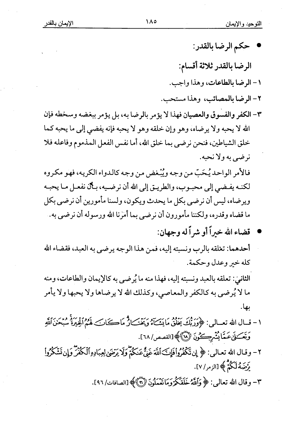 الثاني: تعلقه بالعبد ونسبته إليه، فهذا منه ما يُرضى به كالإيمان والطاعات، ومنه ما لا يُرضى به كالكفر والمعاصي، وكذلك الله لا يرضاها ولا يحبها ولا يأمر بها.