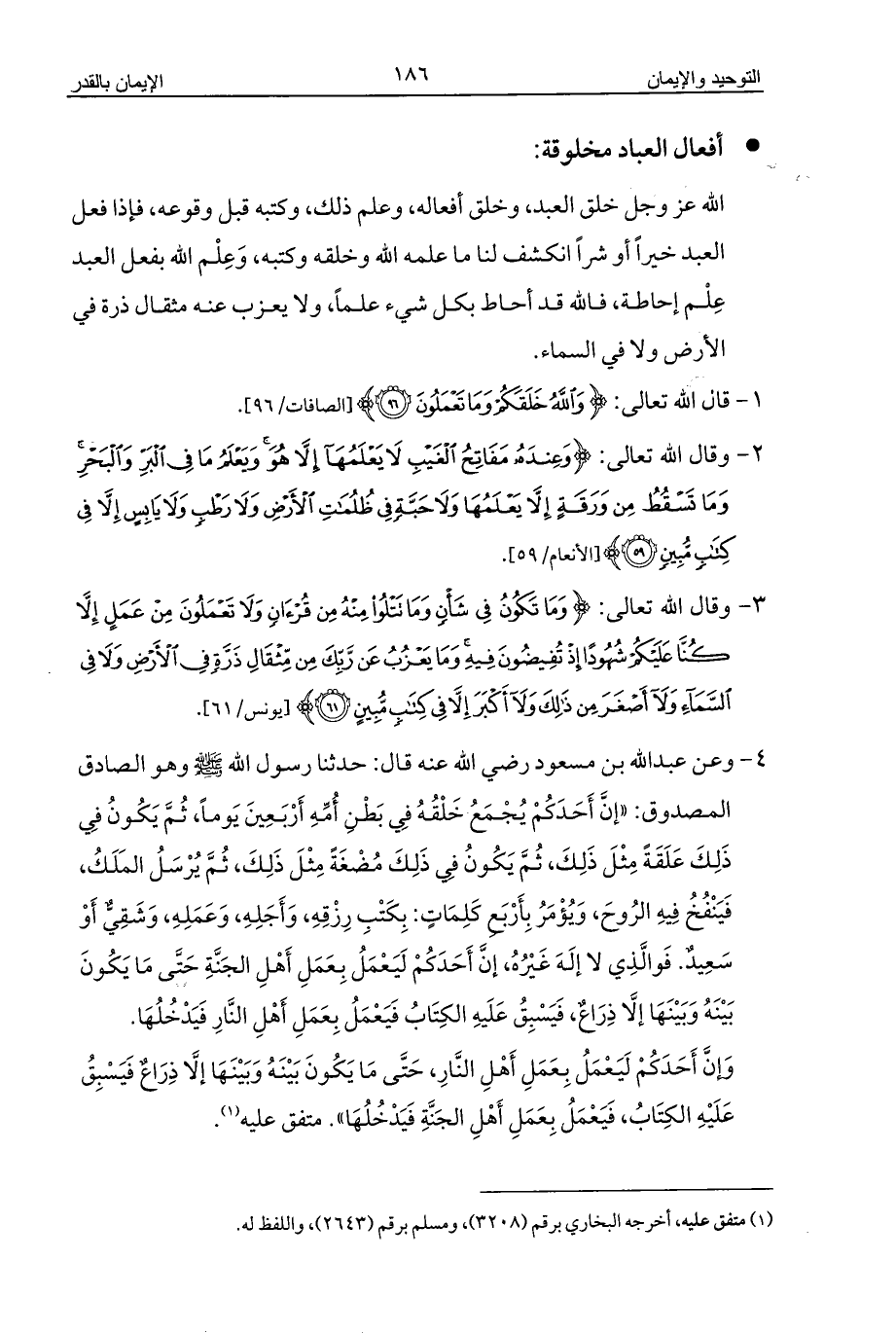 4 - وعن عبد الله بن مسعود رضي الله عنه قال: حدثنا رسول الله - صلى الله عليه وسلم - وهو الصادق المصدوق: «إنَّ أَحَدَكُمْ يُجْمَعُ خَلْقُهُ فِي بَطْنِ أُمِّهِ أَرْبَعِينَ يَوماً، ثُمَّ يَكُونُ فِي ذَلِكَ عَلَقَةً مِثْلَ ذَلِكَ، ثُمَّ يَكُونُ فِي ذَلِكَ مُضْغَةً مِثْلَ ذَلِكَ، ثُمَّ يُرْسَلُ المَلَكُ، فَيَنْفُخُ فِيهِ الرُوحَ، وَيُؤْمَرُ بِأَرْبَعِ كَلِمَاتٍ: بِكَتْبِ رِزْقِهِ، وَأَجَلِهِ، وَعَمَلِهِ، وَشَقِيٌّ أَوْ سَعِيدٌ. فَوالَّذِي لا إلَهَ غَيْرُهُ، إنَّ أَحَدَكُمْ لَيَعْمَلُ بِعَمَلِ أَهْلِ الجَنَّةِ حَتَّى مَا يَكُونَ بَيْنَهُ وَبَيْنَهَا إلَّا ذِرَاعٌ، فَيَسْبِقُ عَلَيهِ الكِتَابُ فَيَعْمَلُ بِعَمَلِ أَهْلِ النَّارِ فَيَدْخُلُهَا.