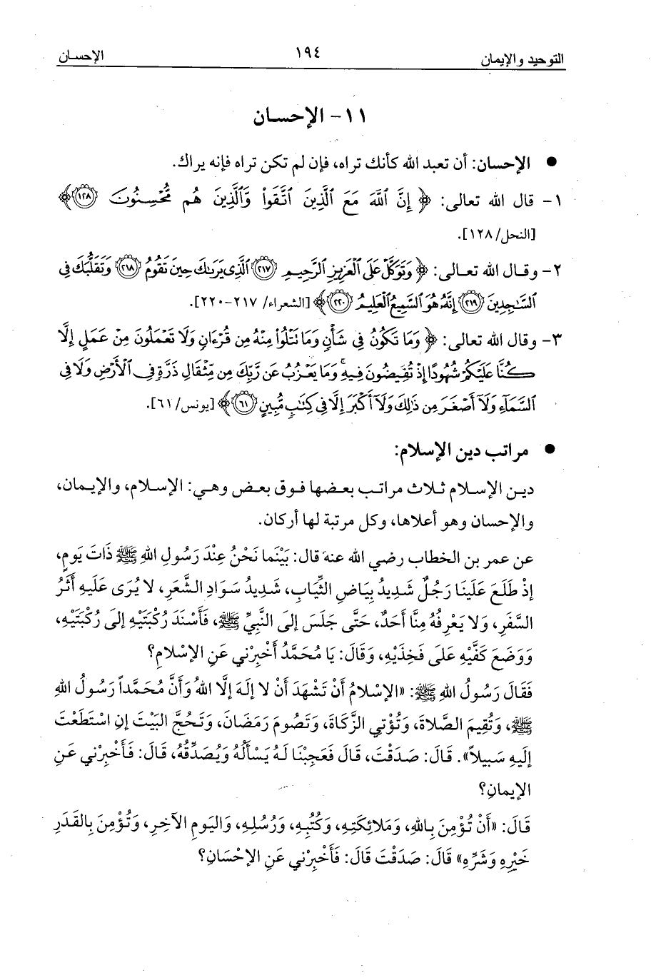 دين الإسلام ثلاث مراتب بعضها فوق بعض وهي: الإسلام، والإيمان، والإحسان وهو أعلاها، وكل مرتبة لها أركان.