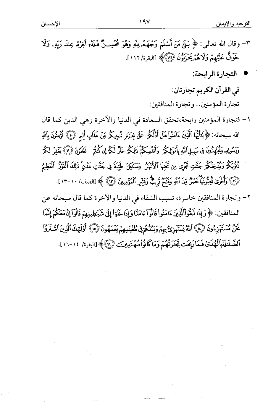 1 - فتجارة المؤمنين رابحة، تحقق السعادة في الدنيا والآخرة وهي الدين كما قال الله سبحانه: {يَاأَيُّهَا الَّذِينَ آمَنُوا هَلْ أَدُلُّكُمْ عَلَى تِجَارَةٍ تُنْجِيكُمْ مِنْ عَذَابٍ أَلِيمٍ (10) تُؤْمِنُونَ بِاللَّهِ وَرَسُولِهِ وَتُجَاهِدُونَ فِي سَبِيلِ اللَّهِ بِأَمْوَالِكُمْ وَأَنْفُسِكُمْ ذَلِكُمْ خَيْرٌ لَكُمْ إِنْ كُنْتُمْ تَعْلَمُونَ (11) يَغْفِرْ لَكُمْ ذُنُوبَكُمْ وَيُدْخِلْكُمْ جَنَّاتٍ تَجْرِي مِنْ تَحْتِهَا الْأَنْهَارُ وَمَسَاكِنَ طَيِّبَةً فِي جَنَّاتِ عَدْنٍ ذَلِكَ الْفَوْزُ الْعَظِيمُ (12) وَأُخْرَى تُحِبُّونَهَا نَصْرٌ مِنَ اللَّهِ وَفَتْحٌ قَرِيبٌ وَبَشِّرِ الْمُؤْمِنِينَ (13)} [الصف/10 - 13].