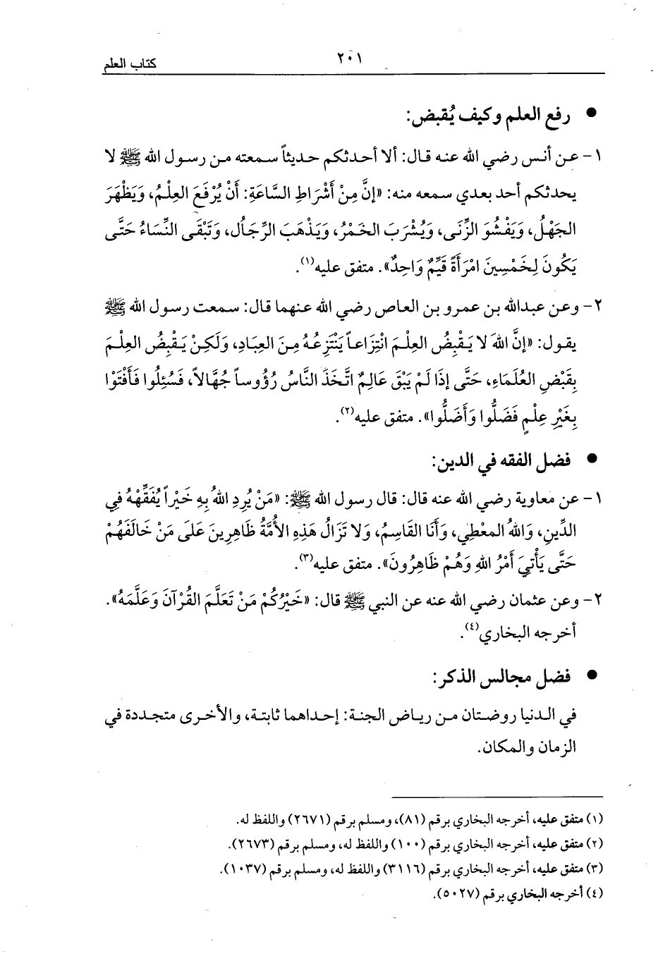 2 - وعن عبد الله بن عمرو بن العاص رضي الله عنهما قال: سمعت رسول الله - صلى الله عليه وسلم - يقول: «إنَّ اللهَ لا يَقْبِضُ العِلْمَ انْتِزَاعاً يَنْتَزِعُهُ مِنَ العِبَادِ، وَلَكِنْ يَقْبِضُ العِلْمَ بِقَبْضِ العُلَمَاءِ، حَتَّى إذَا لَمْ يَبْقَ عَالِمٌ اتَّخَذَ النَّاسُ رُؤُوساً جُهَّالاً، فَسُئِلُوا فَأَفْتَوْا بِغَيْرِ عِلْمٍ فَضَلُّوا وَأَضَلُّوا». متفق عليه (¬2).