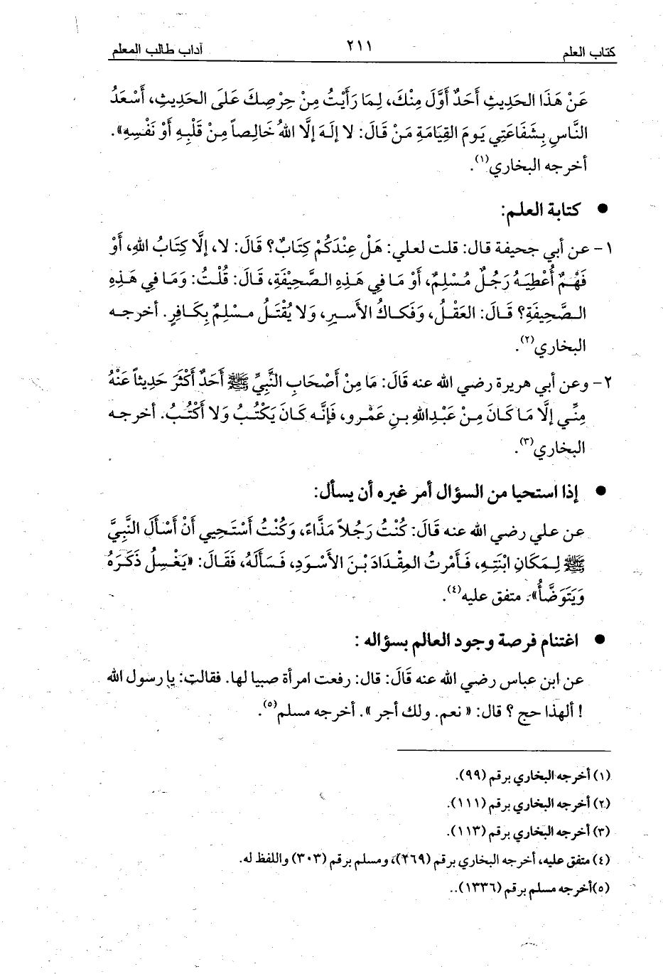 1 - عن أبي جحيفة قال: قلت لعلي: هَلْ عِنْدَكُمْ كِتَابٌ؟ قَالَ: لا، إلَّا كِتَابُ اللهِ، أَوْ فَهْمٌ أُعْطِيَهُ رَجُلٌ مُسْلِمٌ، أَوْ مَا فِي هَذِهِ الصَّحِيْفَةِ، قَالَ: قُلْتُ: وَمَا فِي هَذِهِ الصَّحِيفَةِ؟ قَالَ: العَقْلُ، وَفَكاكُ الأَسيرِ، وَلا يُقْتَلُ مسْلِمٌ بِكَافِرٍ. أخرجه البخاري (¬2).