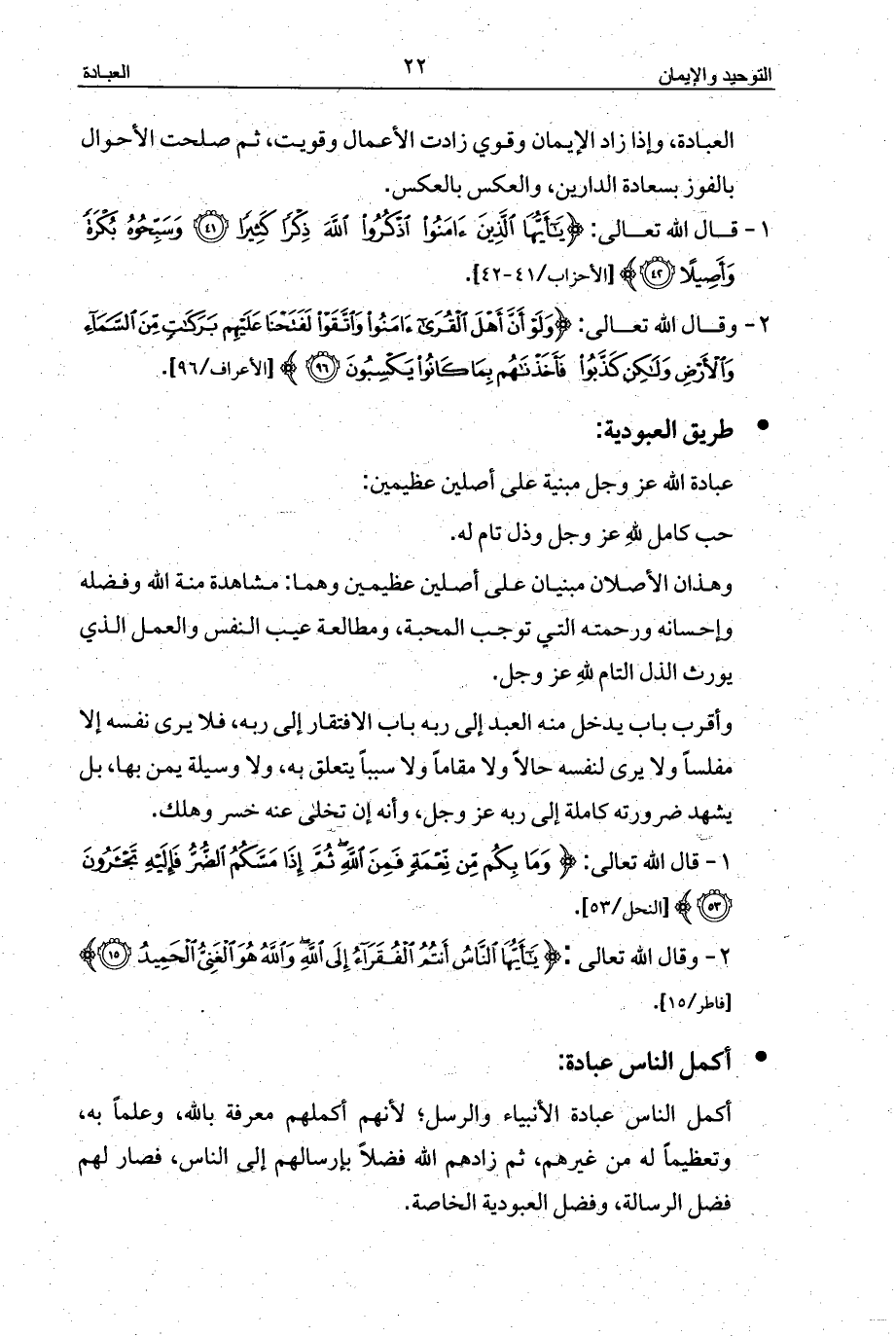 العبادة، وإذا زاد الإيمان وقوي زادت الأعمال وقويت، ثم صلحت الأحوال بالفوز بسعادة الدارين، والعكس بالعكس.