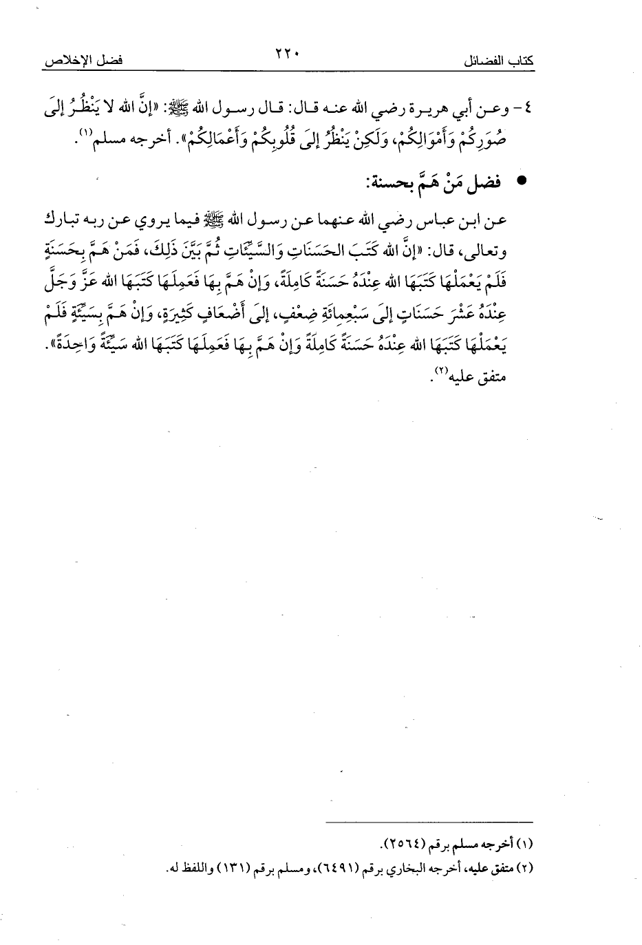 عن ابن عباس رضي الله عنهما عن رسول الله - صلى الله عليه وسلم - فيما يروي عن ربه تبارك وتعالى، قال: «إنَّ الله كَتَبَ الحَسَنَاتِ وَالسَّيِّئَاتِ ثُمَّ بَيَّنَ ذَلِكَ، فَمَنْ هَمَّ بِحَسَنَةٍ فَلَمْ يَعْمَلْهَا كَتَبَهَا الله عِنْدَهُ حَسَنَةً كَامِلَةً، وَإنْ هَمَّ بِهَا فَعَمِلَهَا كَتَبَهَا الله عَزَّ وَجَلَّ عِنْدَهُ عَشْرَ حَسَنَاتٍ إلَى سَبْعِمِائَةِ ضِعْفٍ، إلَى أَضْعَافٍ كَثِيرَةٍ، وَإنْ هَمَّ بِسَيِّئَةٍ فَلَمْ يَعْمَلْهَا كَتَبَهَا الله عِنْدَهُ حَسَنَةً كَامِلَةً وَإنْ هَمَّ بِهَا فَعَمِلَهَا كَتَبَهَا الله سَيِّئَةً وَاحِدَةً». متفق عليه (¬2).