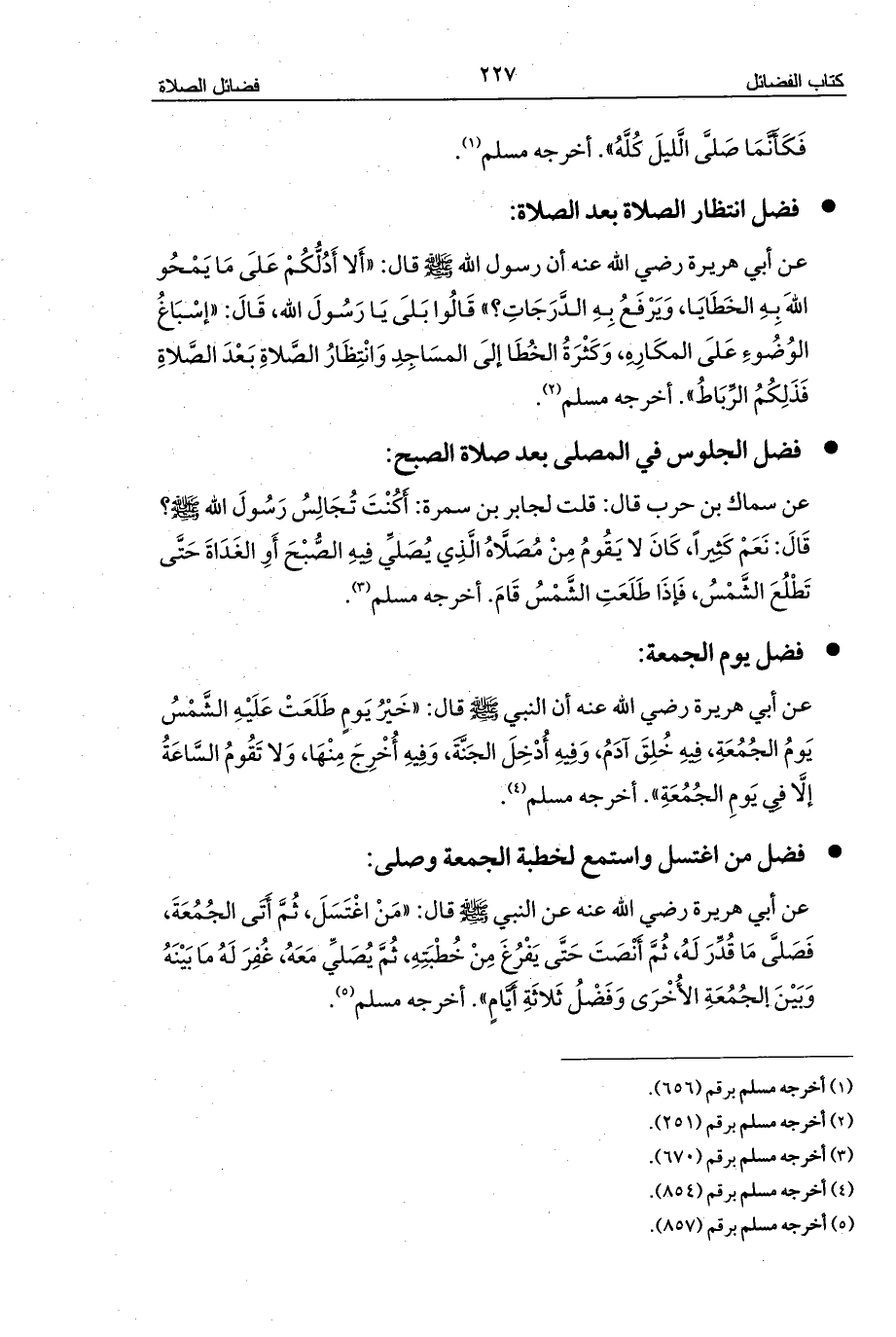 عن أبي هريرة رضي الله عنه أن رسول الله - صلى الله عليه وسلم - قال: «أَلا أَدُلُّكُمْ عَلَى مَا يَمْحُو اللهَ بِهِ الخَطَايَا، وَيَرْفَعُ بِهِ الدَّرَجَاتِ؟» قَالُوا بَلَى يَا رَسُولَ الله، قَالَ: «إسْبَاغُ الوُضُوءِ عَلَى المكَارِهِ، وَكَثْرَةُ الخُطَا إلَى المسَاجِدِ وَانْتِظَارُ الصَّلاةِ بَعْدَ الصَّلاةِ فَذَلِكُمُ الرِّبَاطُ». أخرجه مسلم (¬2).