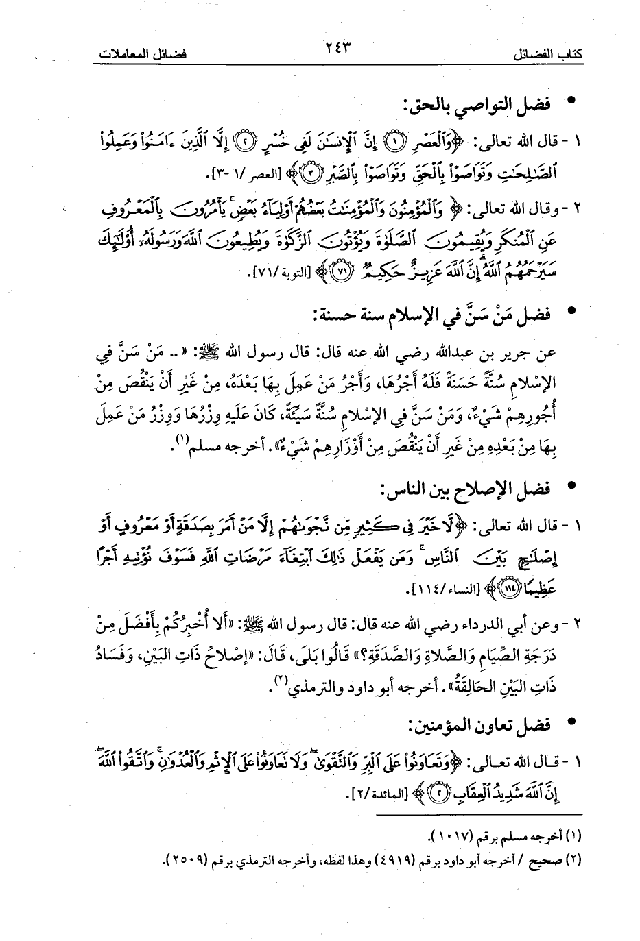 1 - قال الله تعالى: {وَتَعَاوَنُوا عَلَى الْبِرِّ وَالتَّقْوَى وَلَا تَعَاوَنُوا عَلَى الْإِثْمِ وَالْعُدْوَانِ وَاتَّقُوا اللَّهَ إِنَّ اللَّهَ شَدِيدُ الْعِقَابِ (2)} [المائدة/2].