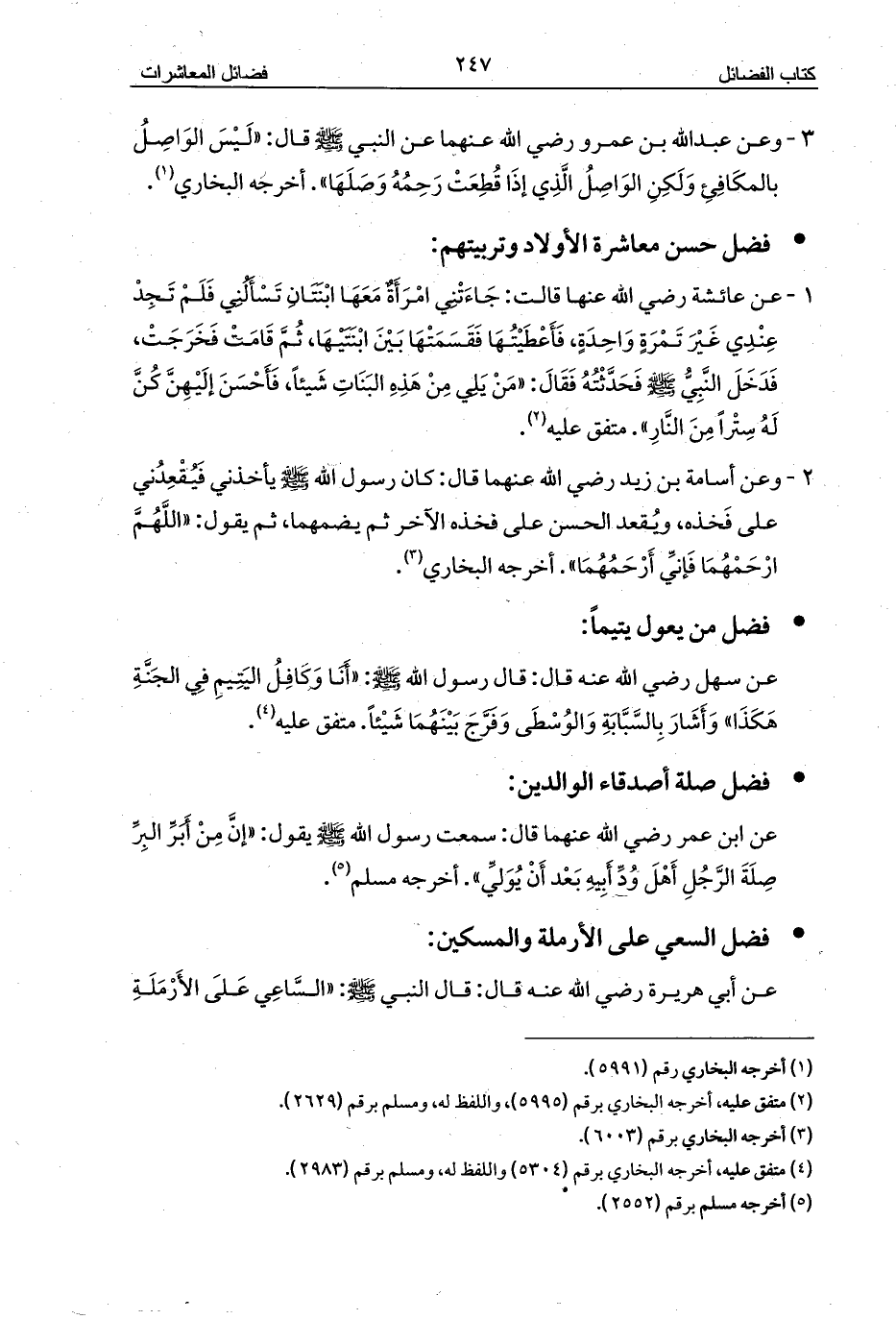 3 - وعن عبد الله بن عمرو رضي الله عنهما عن النبي - صلى الله عليه وسلم - قال: «لَيْسَ الوَاصِلُ بالمكَافِئِ وَلَكِنِ الوَاصِلُ الَّذِي إذَا قُطِعَتْ رَحِمُهُ وَصَلَهَا». أخرجه البخاري (¬1).