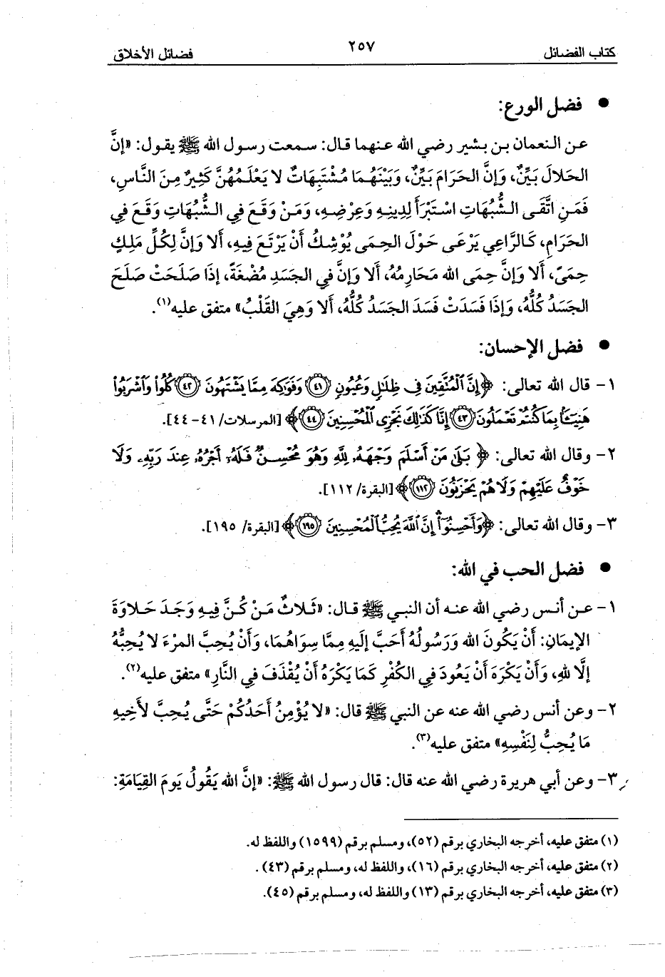 عن النعمان بن بشير رضي الله عنهما قال: سمعت رسول الله - صلى الله عليه وسلم - يقول: «إنَّ الحَلالَ بَيِّنٌ، وَإنَّ الحَرَامَ بَيِّنٌ، وَبَيْنَهُمَا مُشْتَبِهَاتٌ لا يَعْلَمُهُنَّ كَثِيرٌ مِنَ النَّاسِ، فَمَنِ اتَّقَى الشُّبُهَاتِ اسْتَبْرَأَ لِدِينِهِ وَعِرْضِهِ، وَمَنْ وَقَعَ فِي الشُّبُهَاتِ وَقَعَ فِي الحَرَامِ، كَالرَّاعِي يَرْعَى حَوْلَ الحِمَى يُوْشِكُ أَنْ يَرْتَعَ فِيهِ، أَلا وَإنَّ لِكُلِّ مَلِكٍ حِمَىً، أَلا وَإنَّ حِمَى الله مَحَارِمُهُ، أَلا وَإنَّ فِي الجَسَدِ مُضْغَةً، إذَا صَلَحَتْ صَلَحَ الجَسَدُ كُلُّهُ، وَإذَا فَسَدَتْ فَسَدَ الجَسَدُ كُلُّهُ، أَلا وَهِيَ القَلْبُ» متفق عليه (¬1).