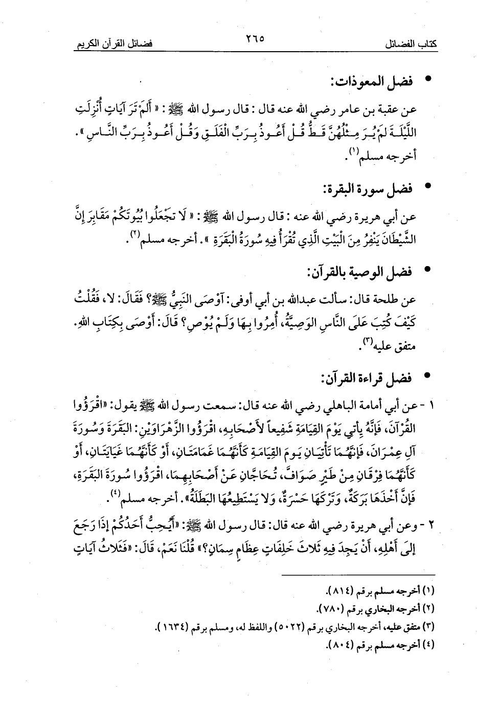 1 - عن أبي أمامة الباهلي رضي الله عنه قال: سمعت رسول الله - صلى الله عليه وسلم - يقول: «اقْرَؤُوا القُرْآنَ، فَإنَّهُ يِأتِي يَوْمَ القِيَامَةِ شَفِيعاً لأَصْحَابِهِ، اقْرَؤُوا الزَّهْرَاوَيْنِ: البَقَرَةَ وَسُورَةَ آلِ عِمْرَانَ، فَإنَّهُمَا تَأْتِيَانِ يَومَ القِيَامَةِ كَأَنَّهُمَا غَمَامَتَانِ، أَوْ كَأَنَّهُمَا غَيَايَتَانِ، أَوْ كَأَنَّهُمَا فِرْقَانِ مِنْ طَيْرٍ صَوَافَّ، تُحَاجَّانِ عَنْ أَصْحَابِهِمَا، اقْرَؤُوا سُورَةَ البَقَرَةِ، فَإنَّ أَخْذَهَا بَرَكَةٌ، وَتَرْكَهَا حَسْرَةٌ، وَلا يَسْتَطِيعُهَا البَطَلَةُ». أخرجه مسلم (¬4).