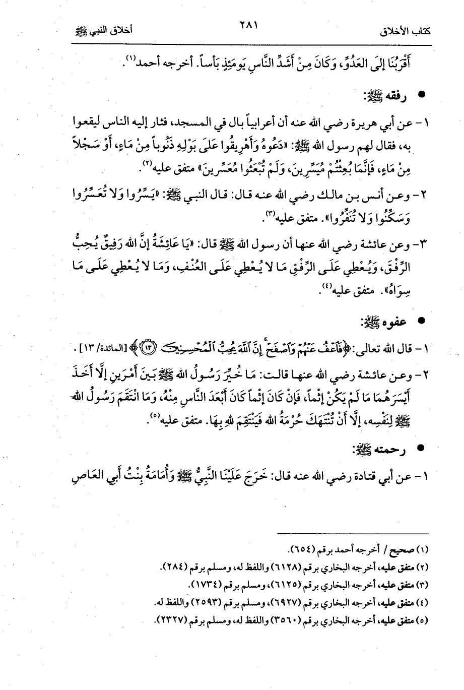 2 - وعن عائشة رضي الله عنها قالت: مَا خُيِّرَ رَسُولُ الله - صلى الله عليه وسلم - بَينَ أَمْرَينِ إلَّا أَخَذَ أَيْسَرَهُمَا مَا لَمْ يَكُنْ إثْماً، فَإنْ كَانَ إثْماً كَانَ أَبْعَدَ النَّاسِ مِنْهُ، وَمَا انْتَقَمَ رَسُولُ الله - صلى الله عليه وسلم - لِنَفْسِه، إلَّا أَنْ تُنْتَهَكَ حُرْمَةُ الله فَيَنْتَقِمَ للهِ بِهَا. متفق عليه (¬5).