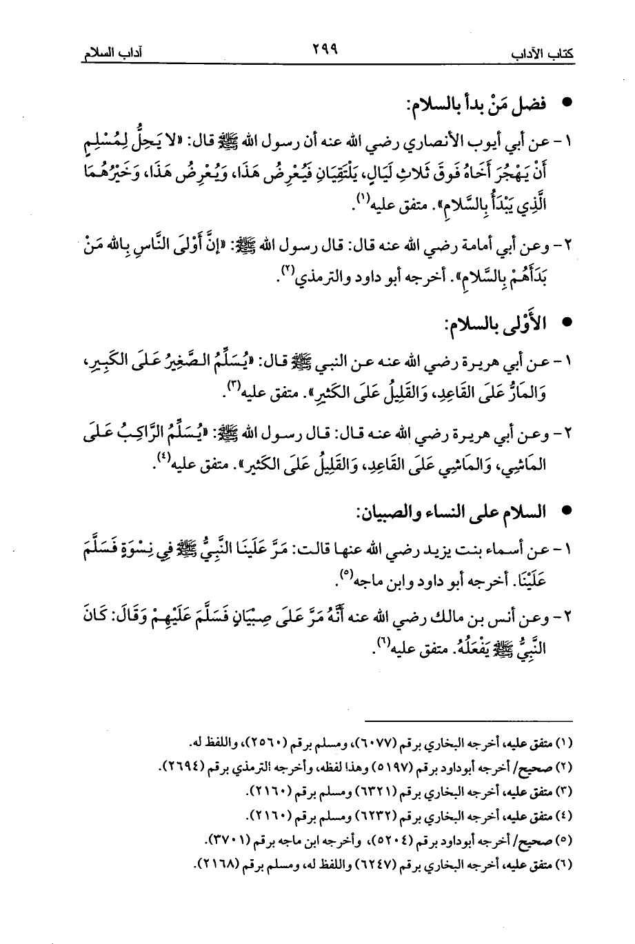1 - عن أبي هريرة رضي الله عنه عن النبي - صلى الله عليه وسلم - قال: «يُسَلِّمُ الصَّغِيرُ عَلَى الكَبِيرِ، وَالمَارُّ عَلَى القَاعِدِ، وَالقَلِيلُ عَلَى الكَثيرِ». متفق عليه (¬3).