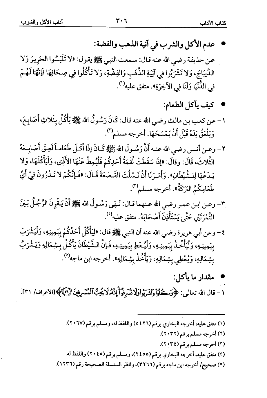 4 - وعن أبي هريرة رضي الله عنه أن النبي - صلى الله عليه وسلم - قال: «لِيَأْكُلْ أَحَدُكُمْ بِيَمِينِهِ، وَلْيَشْرَبْ بِيَمِينِهِ، وَلْيَأْخُذْ بِيَمِينِهِ، وَلْيُعْطِ بِيَمِينِهِ، فَإنَّ الشَّيْطَانَ يَأْكُلُ بِشِمَالِهِ وَيَشْرَبُ بِشِمَالِهِ، وَيُعْطِي بِشِمَالِهِ، وَيَأْخُذُ بِشِمَالِهِ». أخرجه ابن ماجه (¬5).