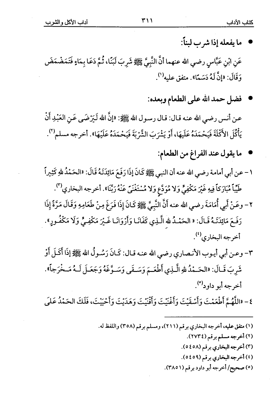 1 - عن أبي أمامة رضي الله عنه أن النبي - صلى الله عليه وسلم - كَانَ إذَا رَفَعَ مَائِدَتَهُ قَالَ: «الحَمْدُ للهِ كَثِيراً طَيِّباً مُبَارَكاً فِيهِ غَيْرَ مَكْفِيٍّ وَلا مُوَدَّعٍ وَلا مُسْتَغْنَىً عَنْهُ رَبَّنَا». أخرجه البخاري (¬3).