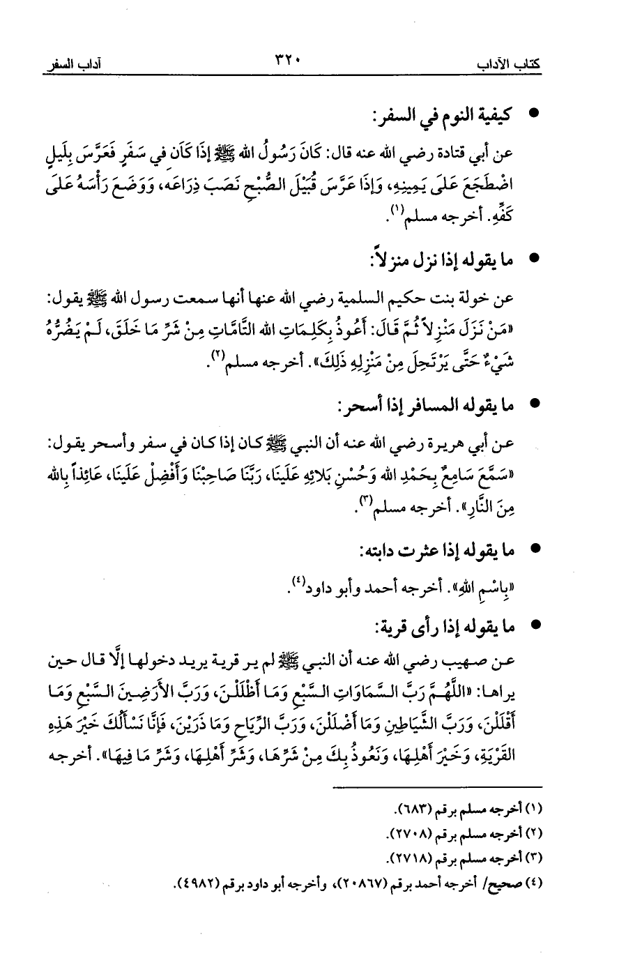 عن أبي قتادة رضي الله عنه قال: كَانَ رَسُولُ الله - صلى الله عليه وسلم - إذَا كَاَن ِفي سَفَرٍ فَعَرَّسَ بِلَيلٍ اضْطَجَعَ عَلَى يَمِينِهِ، وَإذَا عَرَّسَ قُبَيْلَ الصُّبْحِ نَصَبَ ذِرَاعَه، وَوَضَعَ رَأْسَهُ عَلَى كَفِّهِ. أخرجه مسلم (¬1).