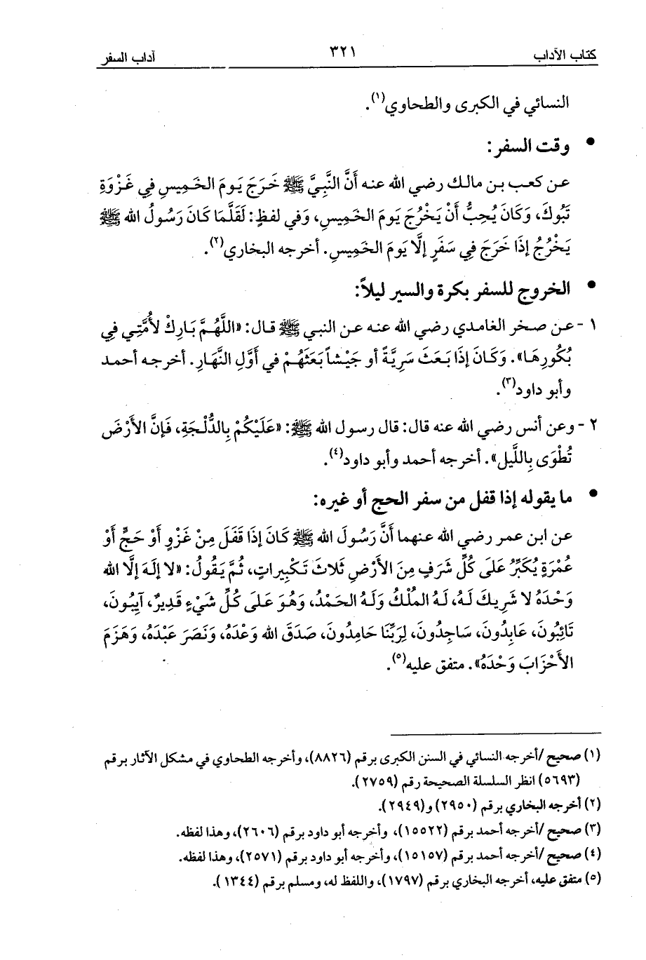 عن ابن عمر رضي الله عنهما أَنَّ رَسُولَ الله - صلى الله عليه وسلم - كَانَ إذَا قَفَلَ مِنْ غَزْوٍ أَوْ حَجٍّ أَوْ عُمْرَةٍ يُكَبِّرُ عَلَى كُلِّ شَرَفٍ مِنَ الأَرْضِ ثَلاثَ تَكْبِيراتٍ، ثُمَّ يَقُولُ: «لا إلَهَ إلَّا الله وَحْدَهُ لا شَرِيكَ لَهُ، لَهُ المُلْكُ وَلَهُ الحَمْدُ، وَهُوَ عَلَى كُلِّ شَيْءٍ قَدِيرٌ، آيِبُونَ، تَائِبُونَ، عَابِدُونَ، سَاجِدُونَ، لِرَبِّنَا حَامِدُونَ، صَدَقَ الله وَعْدَهُ، وَنَصَرَ عَبْدَهُ، وَهَزَمَ الأَحْزَابَ وَحْدَهُ». متفق عليه (¬5).