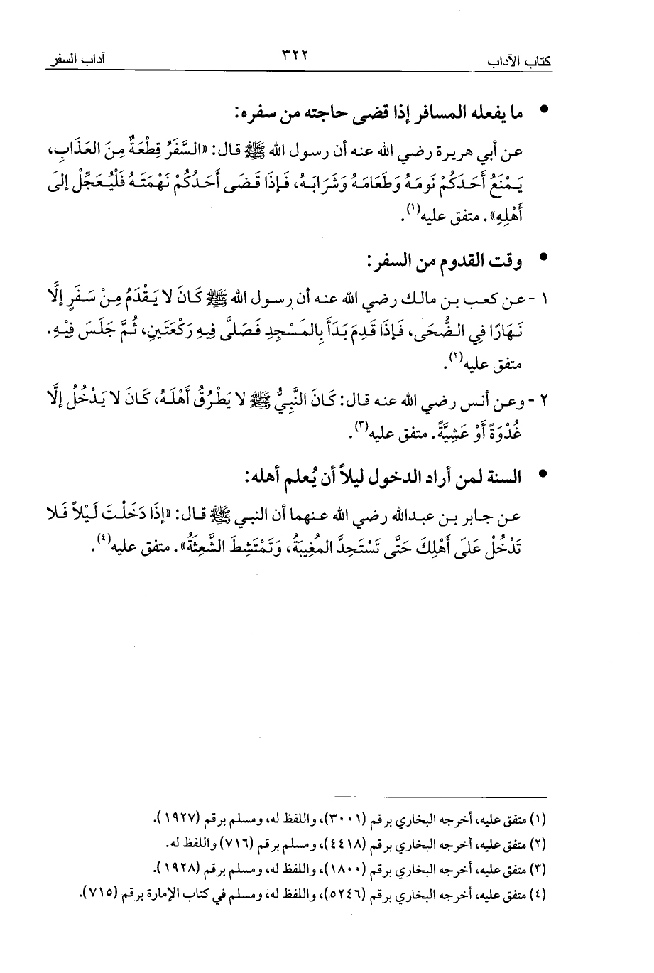1 - عن كعب بن مالك رضي الله عنه أن رسول الله - صلى الله عليه وسلم - كَانَ لا يَقْدَمُ مِنْ سَفَرٍ إلَّا نَهَارًا فِي الضُّحَى، فَإذَا قَدِمَ بَدَأَ بِالمَسْجِدِ فَصَلَّى فِيهِ رَكْعَتَينِ، ثُمَّ جَلَسَ فِيْهِ.