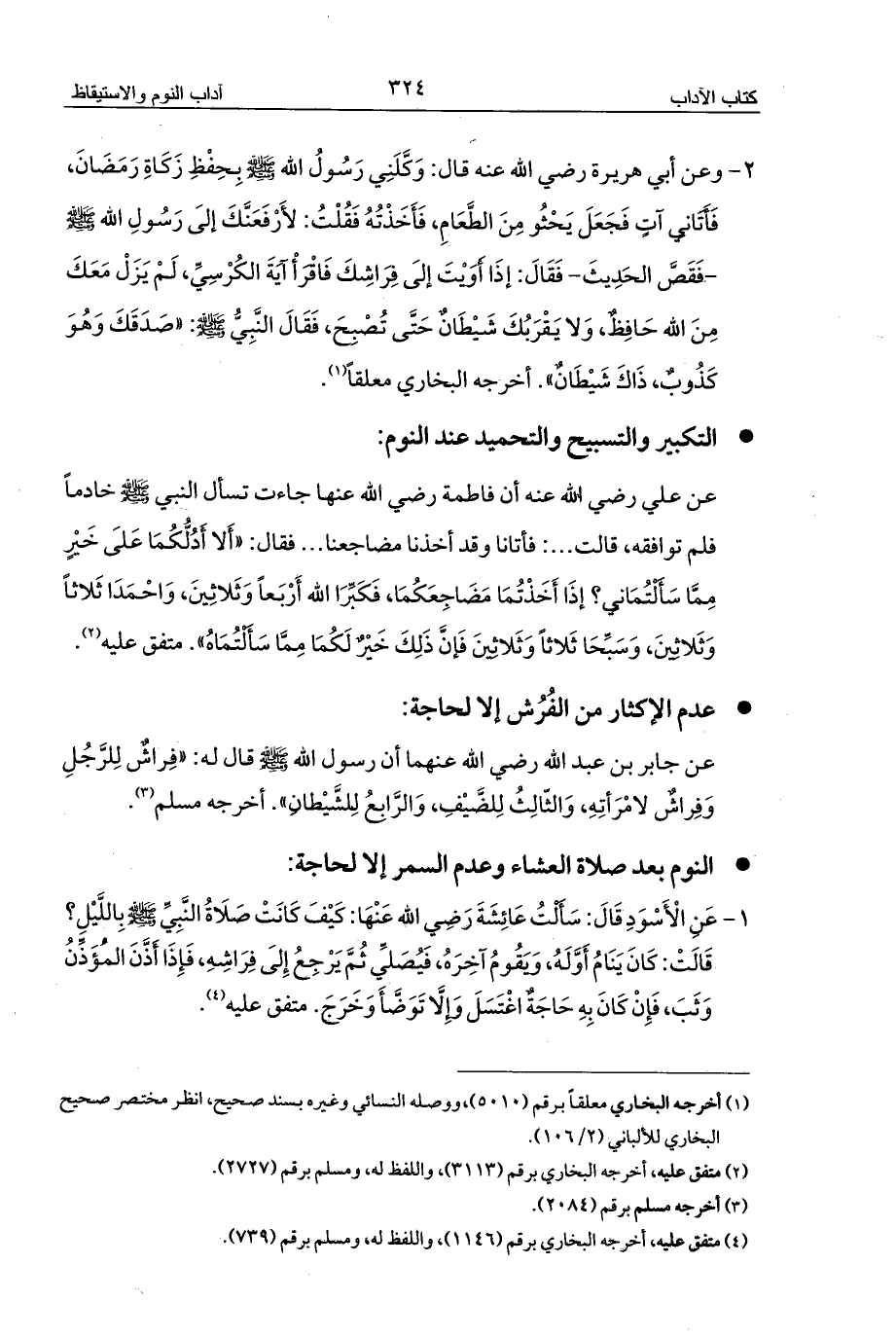 عن علي رضي الله عنه أن فاطمة رضي الله عنها جاءت تسأل النبي - صلى الله عليه وسلم - خادماً فلم توافقه، قالت ... : فأتانا وقد أخذنا مضاجعنا ... فقال: «أَلا أَدُلُّكُمَا عَلَى خَيْرٍ مِمَّا سَأَلْتُمَانِي؟ إذَا أَخَذْتُمَا مَضَاجِعَكُمَا، فَكَبِّرَا الله أَرْبَعاً وَثَلاثِينَ، وَاحْمَدَا ثَلاثاً وَثَلاثِينَ، وَسَبِّحَا ثَلاثاً وَثَلاثِينَ فَإنَّ ذَلِكَ خَيْرٌ لَكُمَا مِمَّا سَأَلْتُمَاهُ». متفق عليه (¬2).