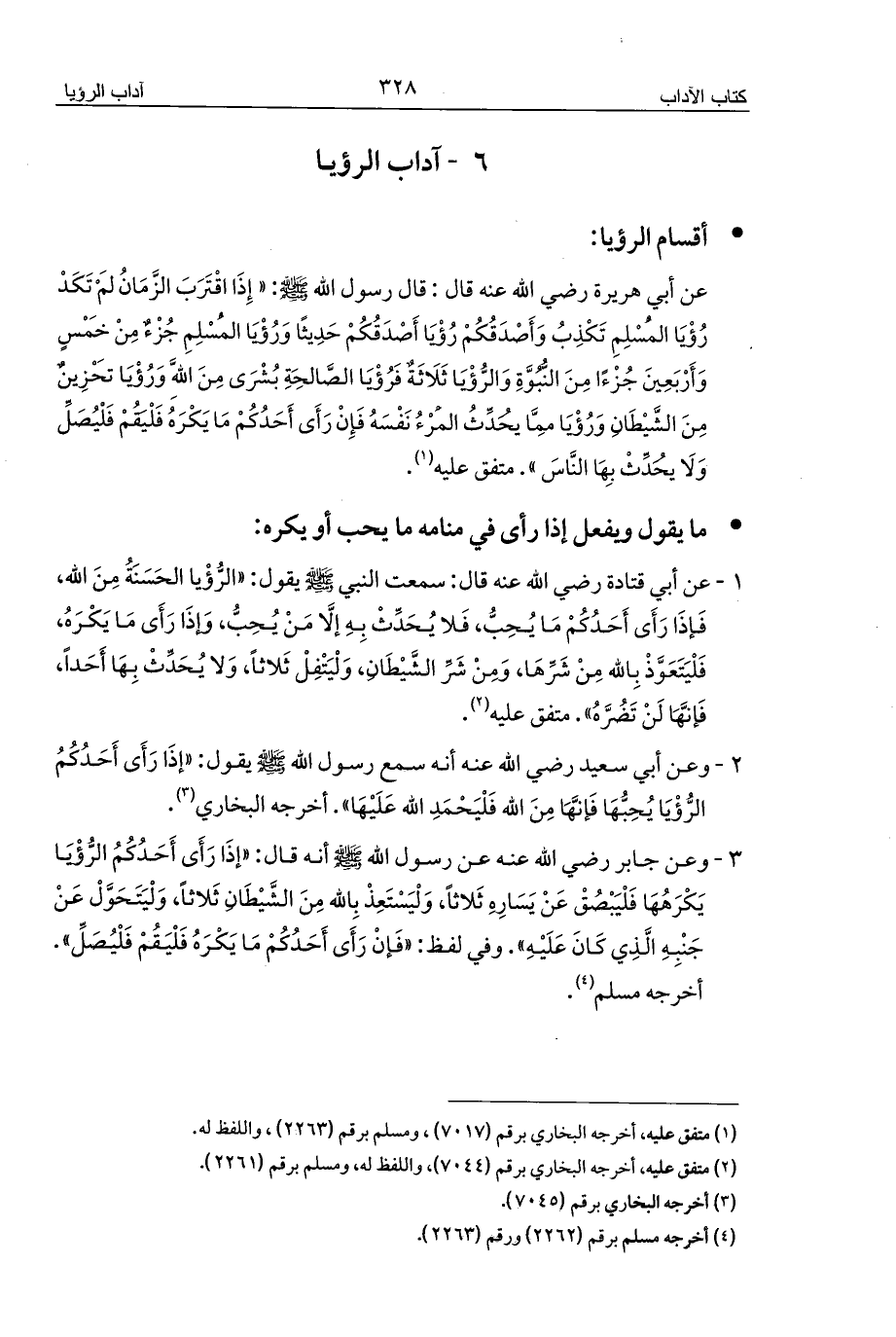 1 - عن أبي قتادة رضي الله عنه قال: سمعت النبي - صلى الله عليه وسلم - يقول: «الرُّؤْيا الحَسَنَةُ مِنَ الله، فَإذَا رَأَى أَحَدُكُمْ مَا يُحِبُّ، فَلا يُحَدِّثْ بِهِ إلَّا مَنْ يُحِبُّ، وَإذَا رَأَى مَا يَكْرَهُ، فَلْيَتَعَوَّذْ بِالله مِنْ شَرِّهَا، وَمِنْ شَرِّ الشَّيْطَانِ، وَلْيَتْفِلْ ثَلاثاً، وَلا يُحَدِّثْ بِهَا أَحَداً، فَإنَّهَا لَنْ تَضُرَّهُ». متفق عليه (¬2).