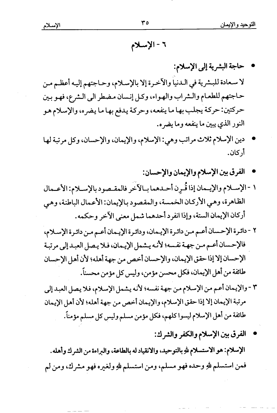 - دين الإسلام ثلاث مراتب وهي: الإسلام، والإيمان، والإحسان، وكل مرتبة لها أركان.