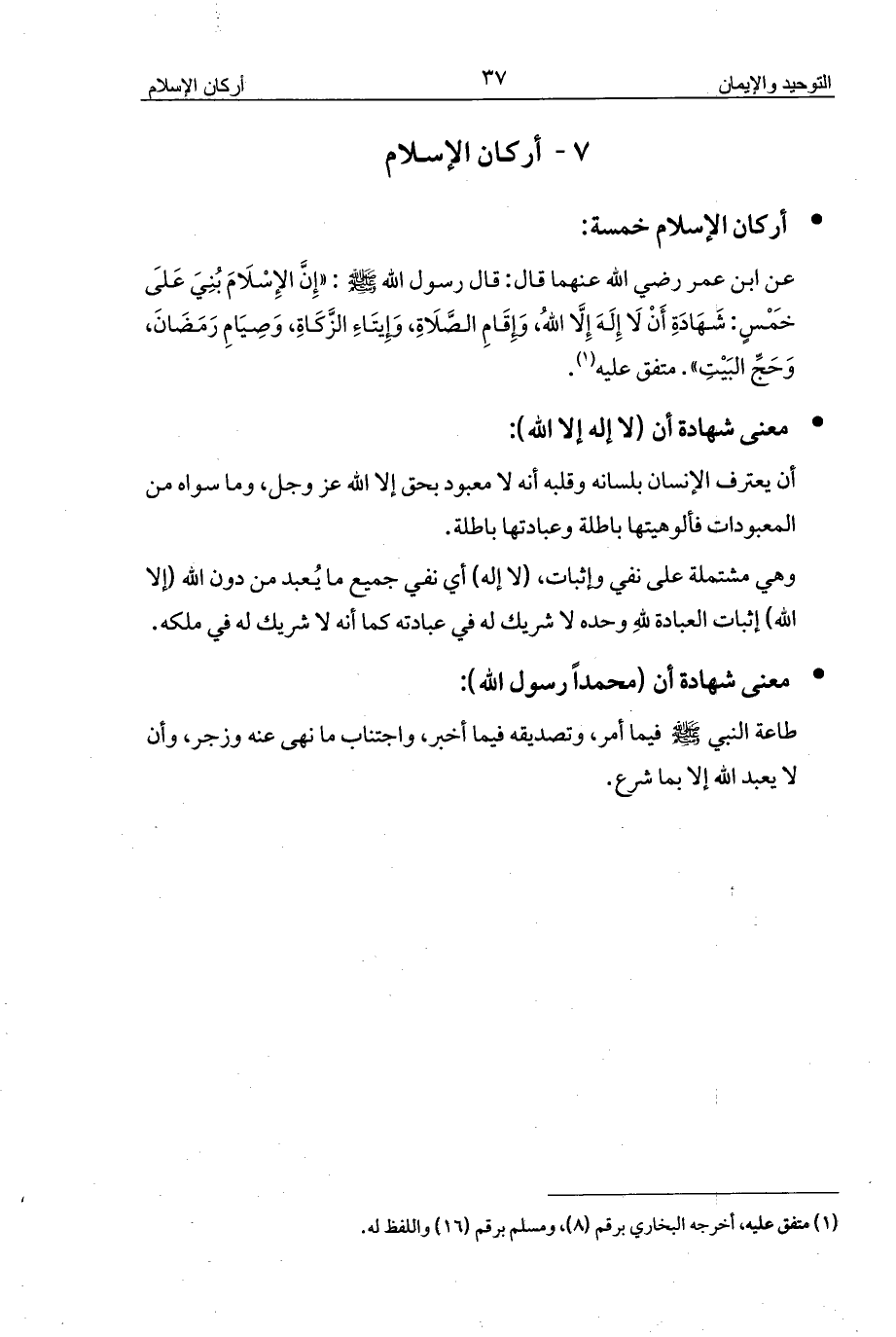 عن ابن عمر رضي الله عنهما قال: قال رسول الله - صلى الله عليه وسلم -: «إِنَّ الإِسْلَامَ بُنِيَ عَلَى خَمْسٍ: شَهَادَةِ أَنْ لَا إِلَهَ إِلَّا اللهُ، وَإِقَامِ الصَّلَاةِ، وَإِيتَاءِ الزَّكَاةِ، وَصِيَامِ رَمَضَانَ، وَحَجِّ البَيْتِ». متفق عليه (¬1).