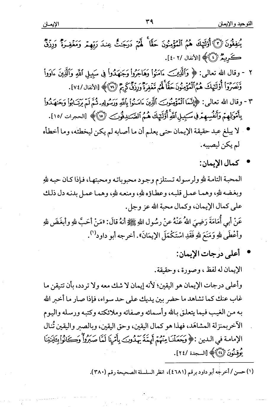 عَنْ أبي أُمَامَةَ رَضِيَ اللهُ عَنْهُ عنْ رسُول اللهِ - صلى الله عليه وسلم - أنهُ قالَ: «مَنْ أحَبَّ للهِ وأبغَضَ للهِ وأعْطَى للهِ وَمَنَعَ للهِ فَقَدِ اسْتَكْمَلَ الإيمَانَ». أخرجه أبو داود (¬1).