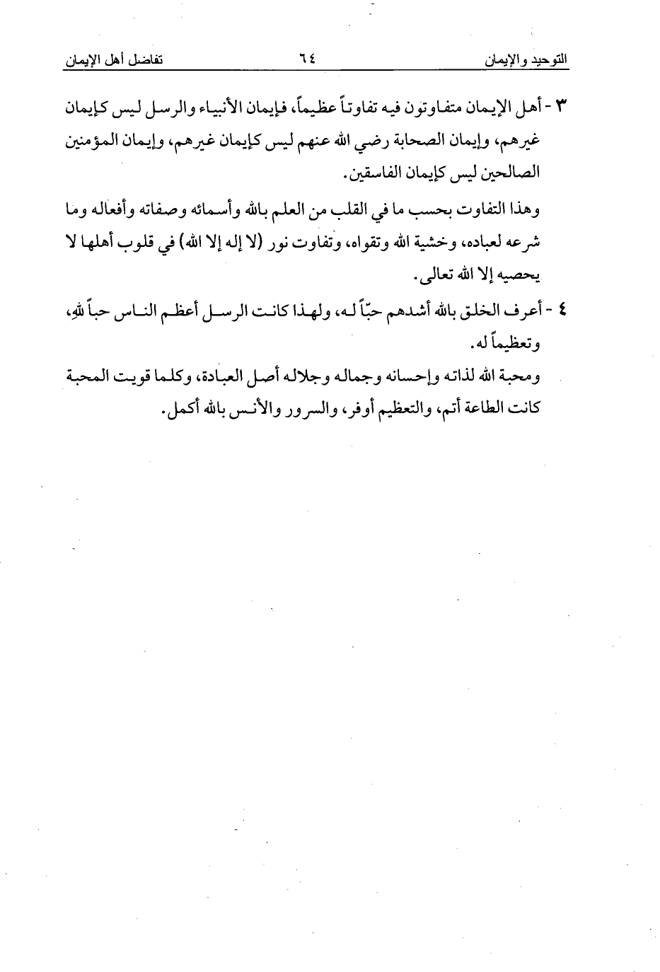 3 - أهل الإيمان متفاوتون فيه تفاوتاً عظيماً، فإيمان الأنبياء والرسل ليس كإيمان غيرهم، وإيمان الصحابة رضي الله عنهم ليس كإيمان غيرهم، وإيمان المؤمنين الصالحين ليس كإيمان الفاسقين.