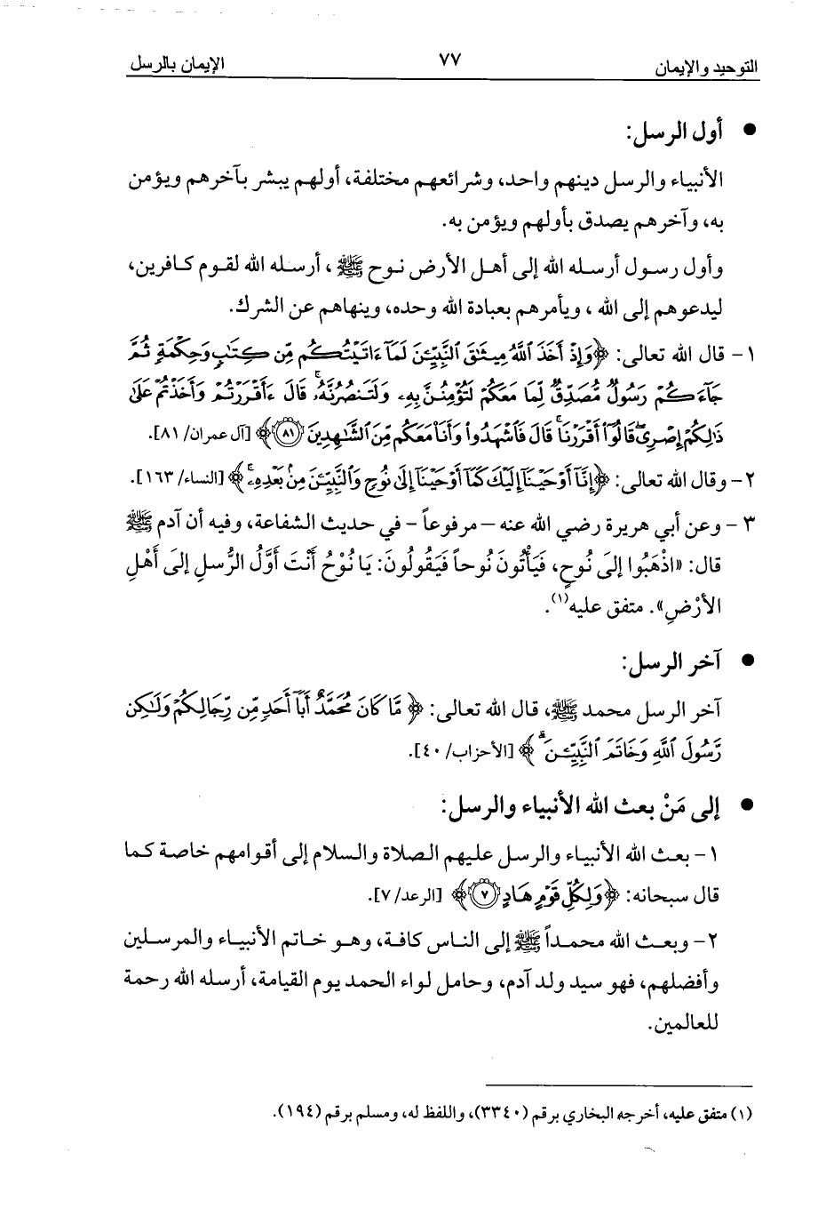 2 - وبعث الله محمداً - صلى الله عليه وسلم - إلى الناس كافة، وهو خاتم الأنبياء والمرسلين وأفضلهم، فهو سيد ولد آدم، وحامل لواء الحمد يوم القيامة، أرسله الله رحمة للعالمين.