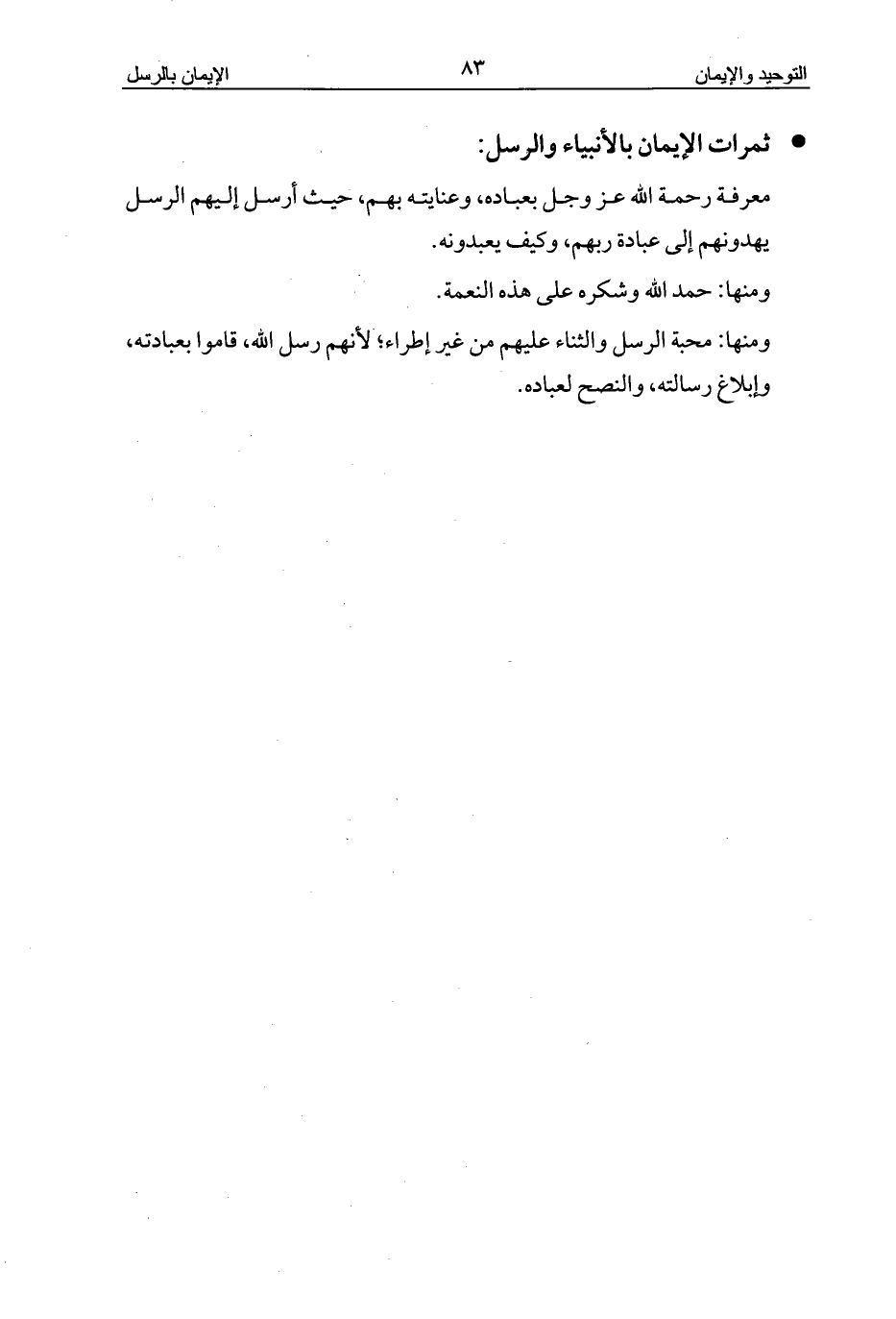 ومنها: محبة الرسل والثناء عليهم من غير إطراء؛ لأنهم رسل الله، قاموا بعبادته، وإبلاغ رسالته، والنصح لعباده.