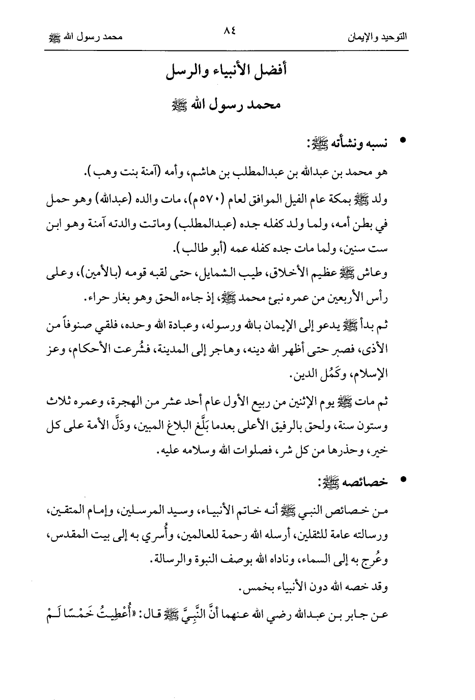 من خصائص النبي - صلى الله عليه وسلم - أنه خاتم الأنبياء، وسيد المرسلين، وإمام المتقين، ورسالته عامة للثقلين، أرسله الله رحمة للعالمين، وأُسري به إلى بيت المقدس، وعُرج به إلى السماء، وناداه الله بوصف النبوة والرسالة.