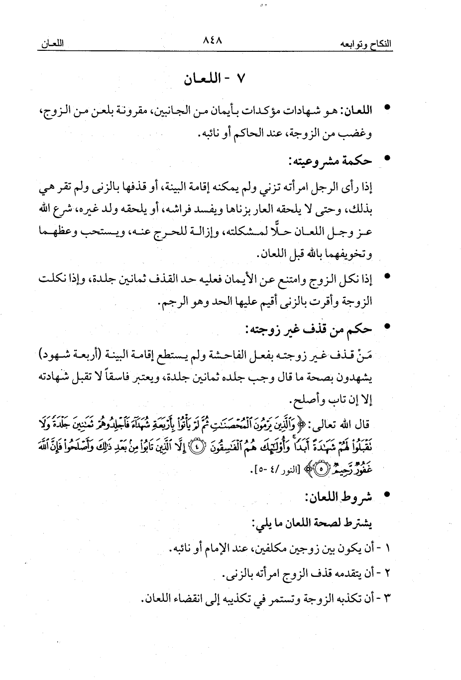 - اللعان: هو شهادات مؤكدات بأيمان من الجانبين، مقرونة بلعن من الزوج، وغضب من الزوجة، عند الحاكم أو نائبه.