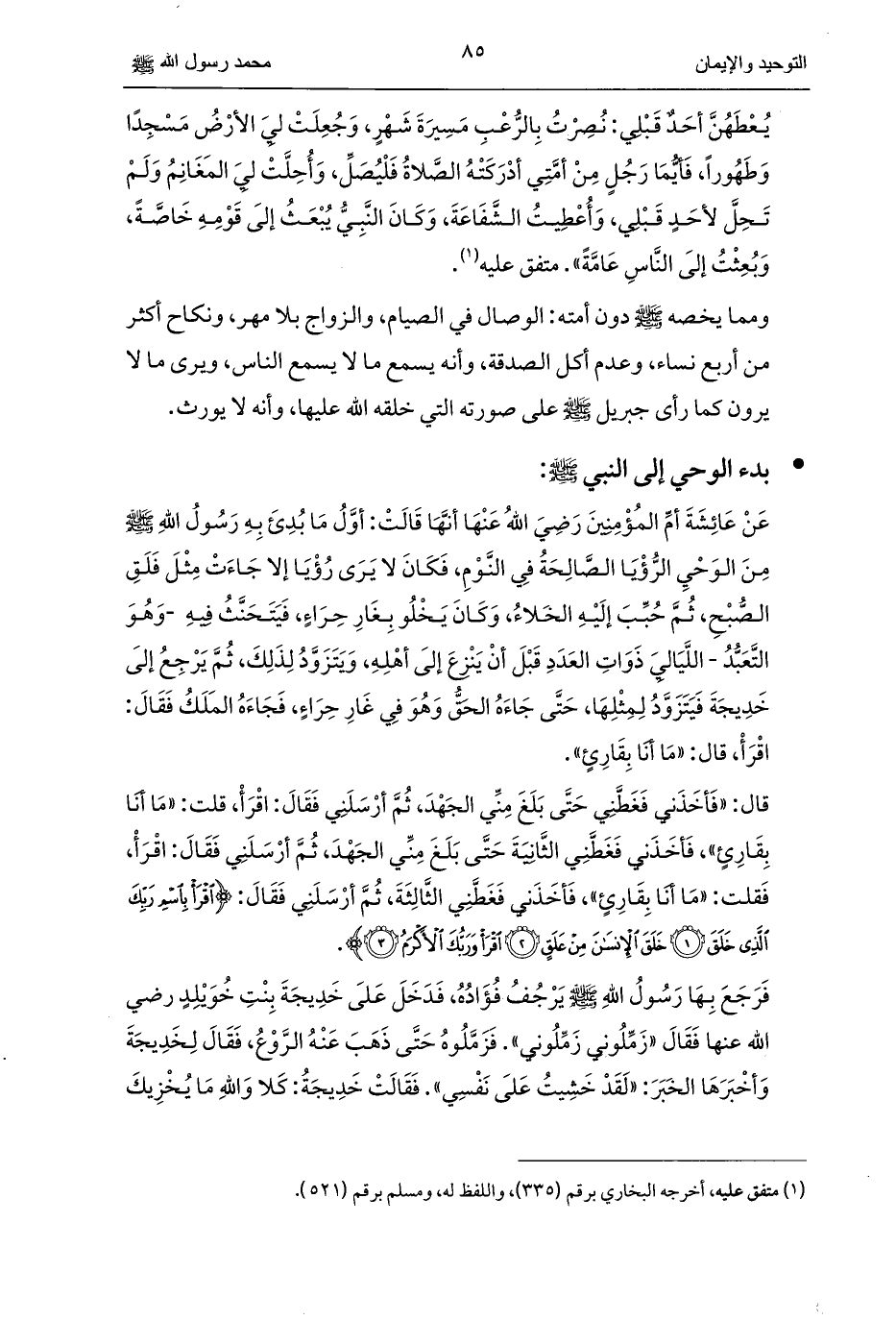 عَنْ عَائِشَةَ أمِّ المُؤْمِنِينَ رَضِيَ اللهُ عَنْهَا أنَّهَا قَالَتْ: أوَّلُ مَا بُدِئَ بِهِ رَسُولُ اللهِ - صلى الله عليه وسلم - مِنَ الوَحْيِ الرُّؤْيَا الصَّالِحَةُ فِي النَّوْمِ، فَكَانَ لا يَرَى رُؤْيَا إلا جَاءَتْ مِثْلَ فَلَقِ الصُّبْحِ، ثُمَّ حُبِّبَ إلَيْهِ الخَلاءُ، وَكَانَ يَخْلُو بِغَارِ حِرَاءٍ، فَيَتَحَنَّثُ فِيهِ -وَهُوَ التَّعَبُّدُ- اللَّيَالِيَ ذَوَاتِ العَدَدِ قَبْلَ أنْ يَنْزِعَ إلَى أهْلِهِ، وَيَتَزَوَّدُ لِذَلِكَ، ثُمَّ يَرْجِعُ إلَى خَدِيجَةَ فَيَتَزَوَّدُ لِمِثْلِهَا، حَتَّى جَاءَهُ الحَقُّ وَهُوَ فِي غَارِ حِرَاءٍ، فَجَاءَهُ المَلَكُ فَقَالَ: اقْرَأْ، قال: «مَا أنَا بِقَارِئٍ».