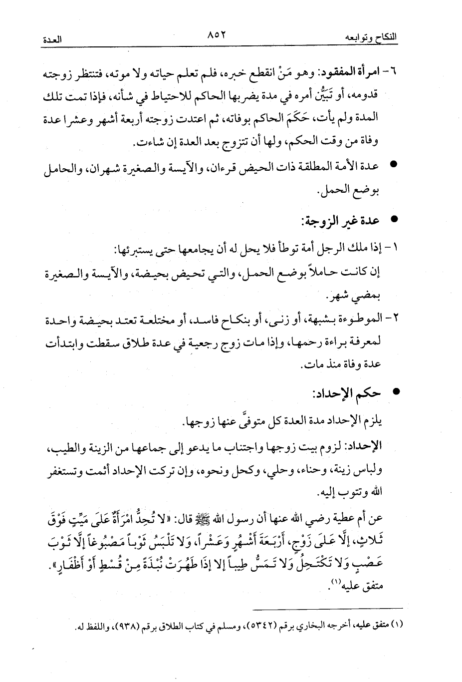 عن أم عطية رضي الله عنها أن رسول الله - صلى الله عليه وسلم - قال: «لا تُحِدُّ امْرَأَةٌ عَلَى مَيِّتٍ فَوْقَ ثَلاثٍ، إلَّا عَلَى زَوْجٍ، أَرْبَعَةَ أَشْهُرٍ وَعَشْراً، وَلا تَلْبَسُ ثَوْباً مَصْبُوغاً إلَّا ثَوْبَ عَصْبٍ وَلا تَكْتَحِلُ وَلا تَمَسُّ طِيباً إلا إذَا طَهُرَتْ نُبْذَةً مِنْ قُسْطٍ أَوْ أَظْفَارٍ».