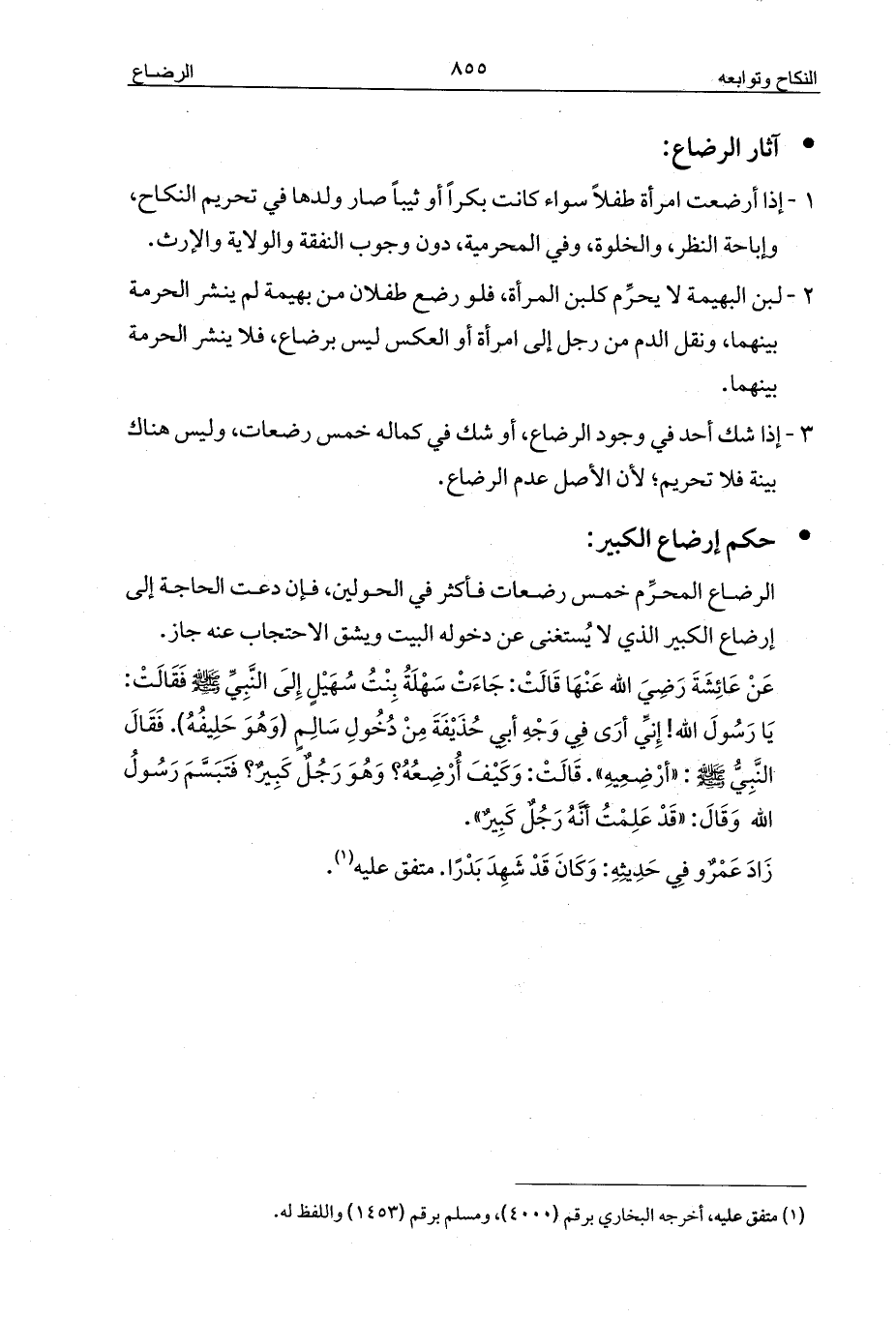 عَنْ عَائِشَةَ رَضِيَ الله عَنْهَا قَالَتْ: جَاءَتْ سَهْلَةُ بِنْتُ سُهَيْلٍ إِلَى النَّبِيِّ - صلى الله عليه وسلم - فَقَالَتْ: يَا رَسُولَ الله! إِنِّي أرَى فِي وَجْهِ أبِي حُذَيْفَةَ مِنْ دُخُولِ سَالِمٍ (وَهُوَ حَلِيفُهُ). فَقَالَ النَّبِيُّ - صلى الله عليه وسلم -: «أرْضِعِيهِ». قَالَتْ: وَكَيْفَ أُرْضِعُهُ؟ وَهُوَ رَجُلٌ كَبِيرٌ؟ فَتَبَسَّمَ رَسُولُ الله وَقَالَ: «قَدْ عَلِمْتُ أنَّهُ رَجُلٌ كَبِيرٌ».