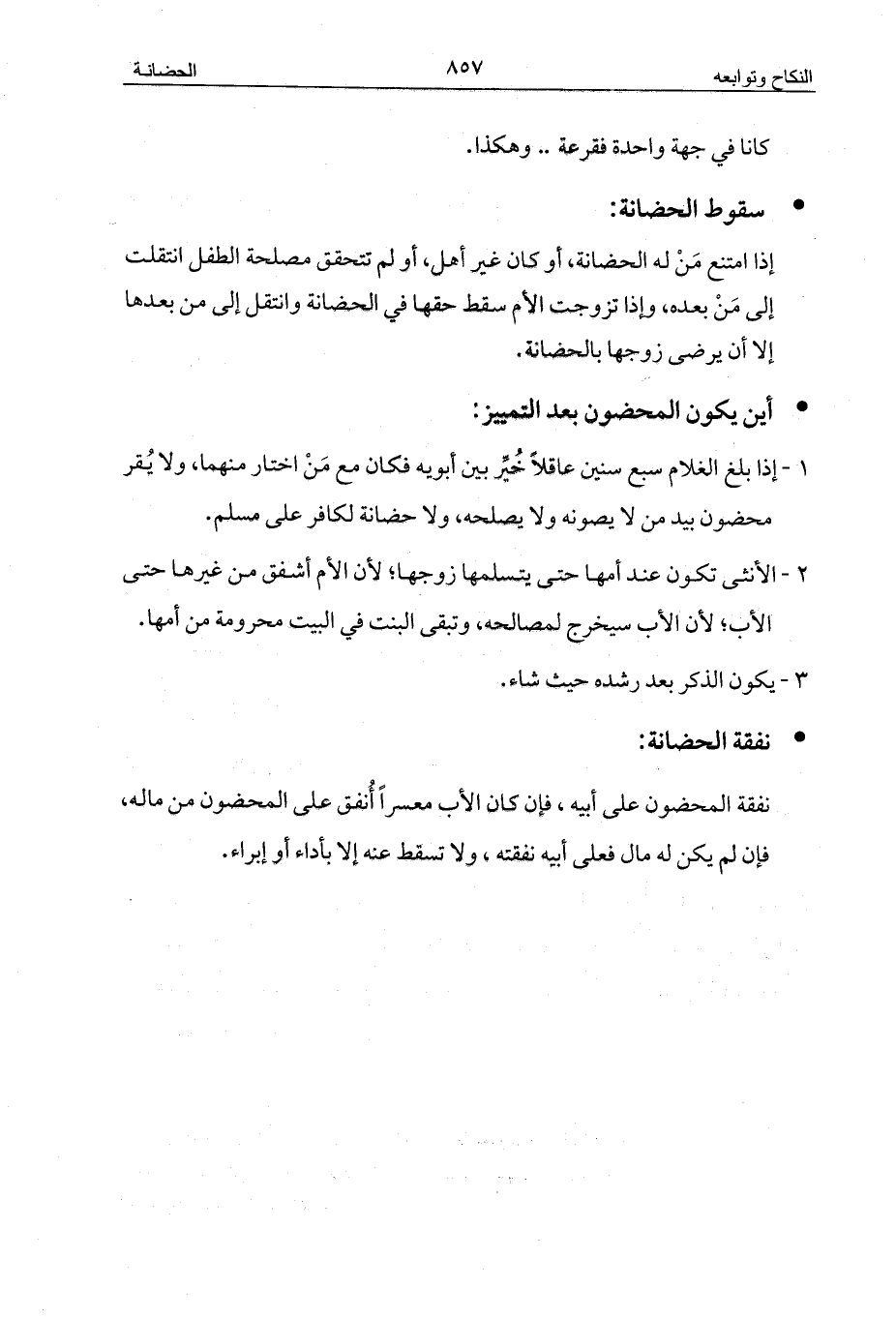 1 - إذا بلغ الغلام سبع سنين عاقلاً خُيِّر بين أبويه فكان مع مَنْ اختار منهما، ولا يُقر محضون بيد من لا يصونه ولا يصلحه، ولا حضانة لكافر على مسلم.