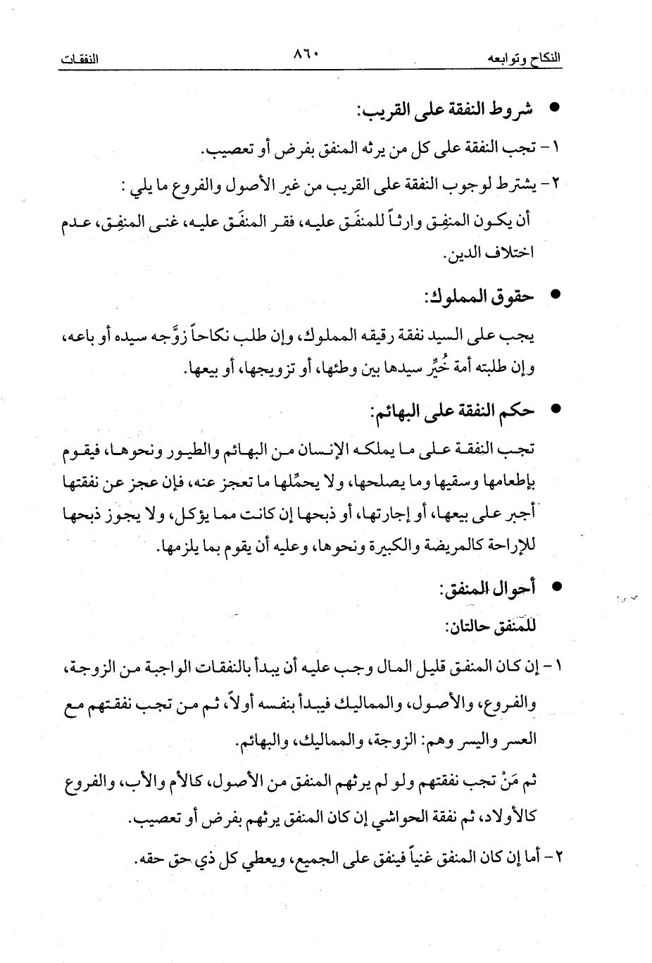 1 - إن كان المنفق قليل المال وجب عليه أن يبدأ بالنفقات الواجبة من الزوجة، والفروع، والأصول، والمماليك فيبدأ بنفسه أولاً، ثم من تجب نفقتهم مع العسر واليسر وهم: الزوجة، والمماليك، والبهائم.