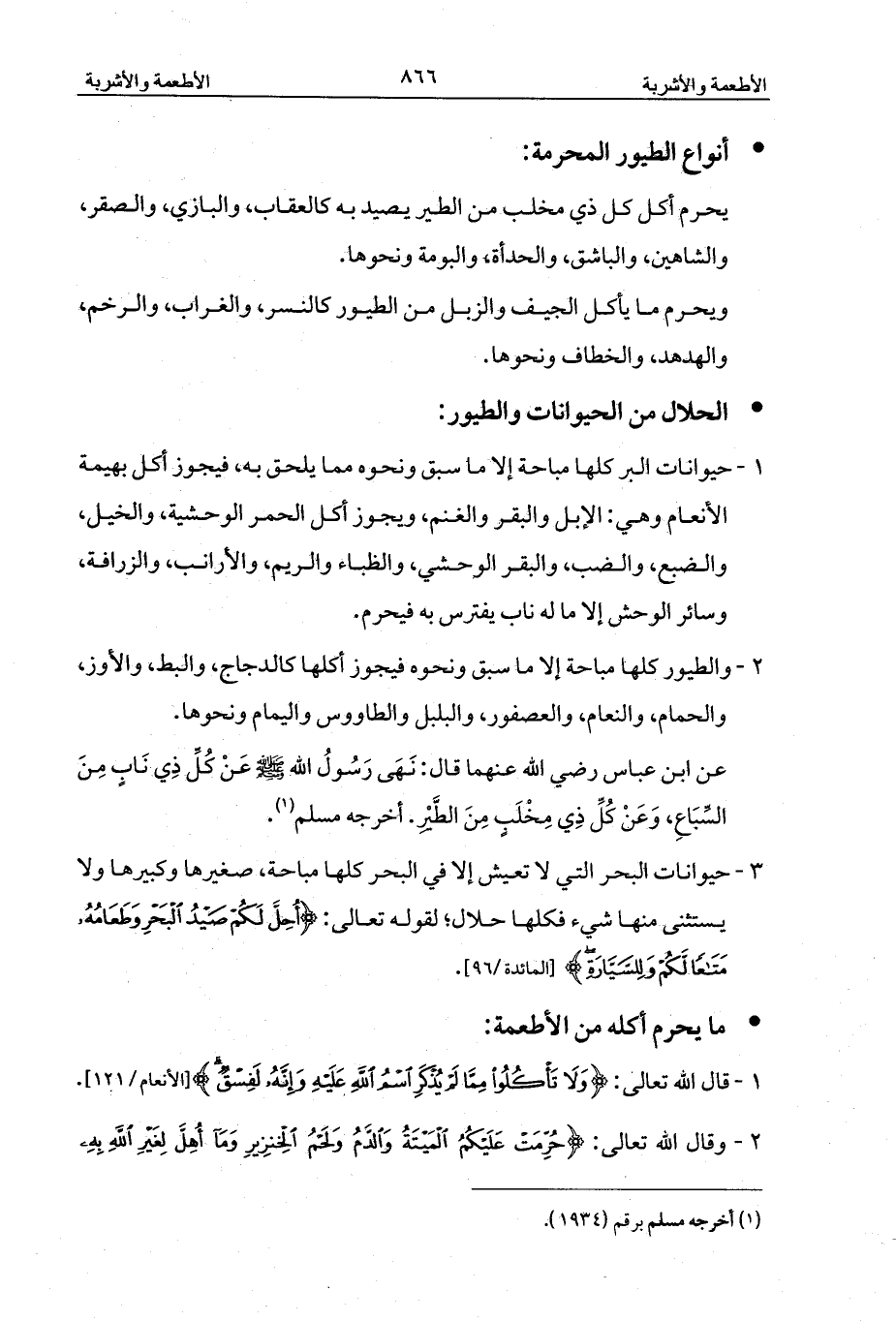 2 - والطيور كلها مباحة إلا ما سبق ونحوه فيجوز أكلها كالدجاج، والبط، والأوز، والحمام، والنعام، والعصفور، والبلبل والطاووس واليمام ونحوها.
