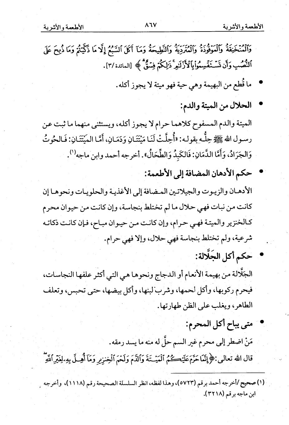 الميتة والدم المسفوح كلاهما حرام لا يجوز أكله، ويستثنى منهما ما ثبت عن رسول الله - صلى الله عليه وسلم - حِلُّه بقوله: «أُحِلَّتْ لَنَا مَيْتَتَانِ وَدَمَانِ، أَمَّا المَيْتَتَانِ: فَالحُوتُ وَالجَرَادُ، وَأَمَّا الدَّمَانِ: فَالكَبِدُ وَالطِّحَالُ». أخرجه أحمد وابن ماجه (¬1).