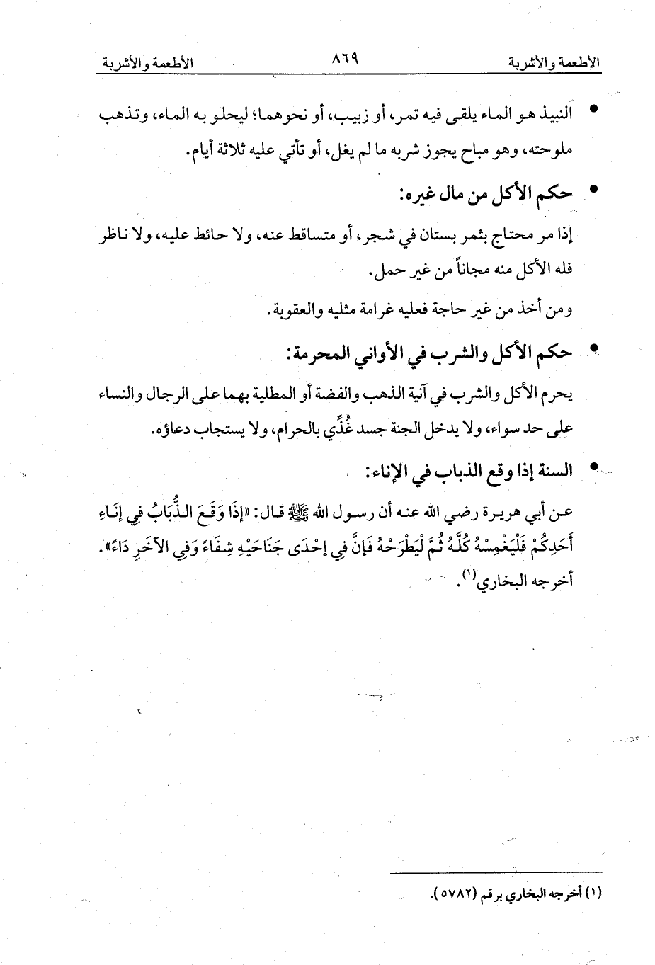 عن أبي هريرة رضي الله عنه أن رسول الله - صلى الله عليه وسلم - قال: «إذَا وَقَعَ الذُّبَابُ فِي إنَاءِ أَحَدِكُمْ فَلْيَغْمِسْهُ كُلَّهُ ثُمَّ لْيَطْرَحْهُ فَإنَّ فِي إحْدَى جَنَاحَيْهِ شِفَاءً وَفِي الآخَرِ دَاءً». أخرجه البخاري (¬1).