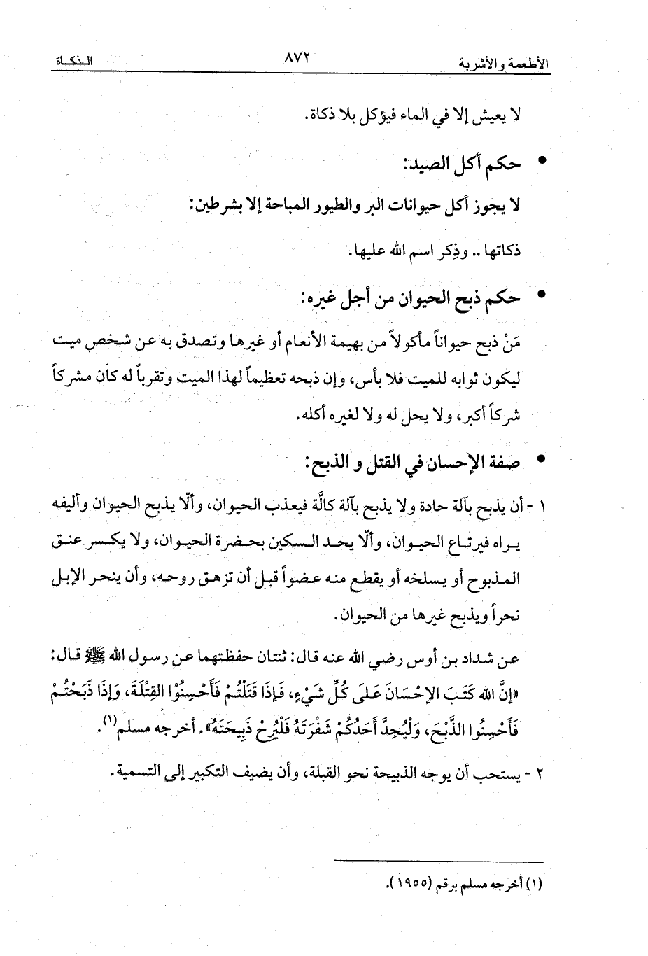1 - أن يذبح بآلة حادة ولا يذبح بآلة كالَّة فيعذب الحيوان، وألّا يذبح الحيوان وأليفه يراه فيرتاع الحيوان، وألّا يحد السكين بحضرة الحيوان، ولا يكسر عنق المذبوح أو يسلخه أو يقطع منه عضواً قبل أن تزهق روحه، وأن ينحر الإبل نحراً ويذبح غيرها من الحيوان.