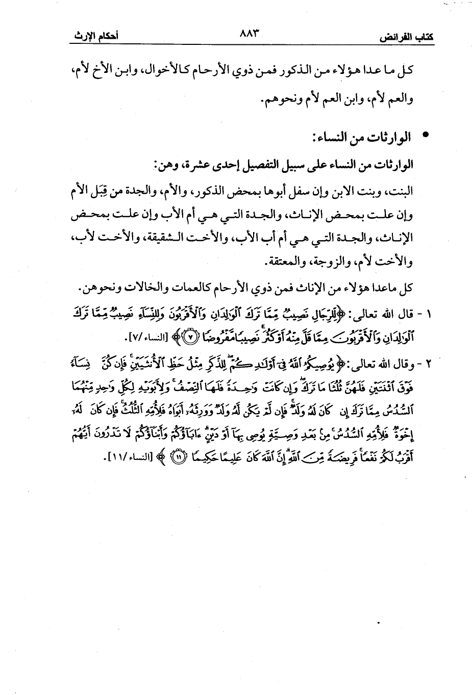 1 - قال الله تعالى: {لِلرِّجَالِ نَصِيبٌ مِمَّا تَرَكَ الْوَالِدَانِ وَالْأَقْرَبُونَ وَلِلنِّسَاءِ نَصِيبٌ مِمَّا تَرَكَ الْوَالِدَانِ وَالْأَقْرَبُونَ مِمَّا قَلَّ مِنْهُ أَوْ كَثُرَ نَصِيبًا مَفْرُوضًا (7)} [النساء/7].