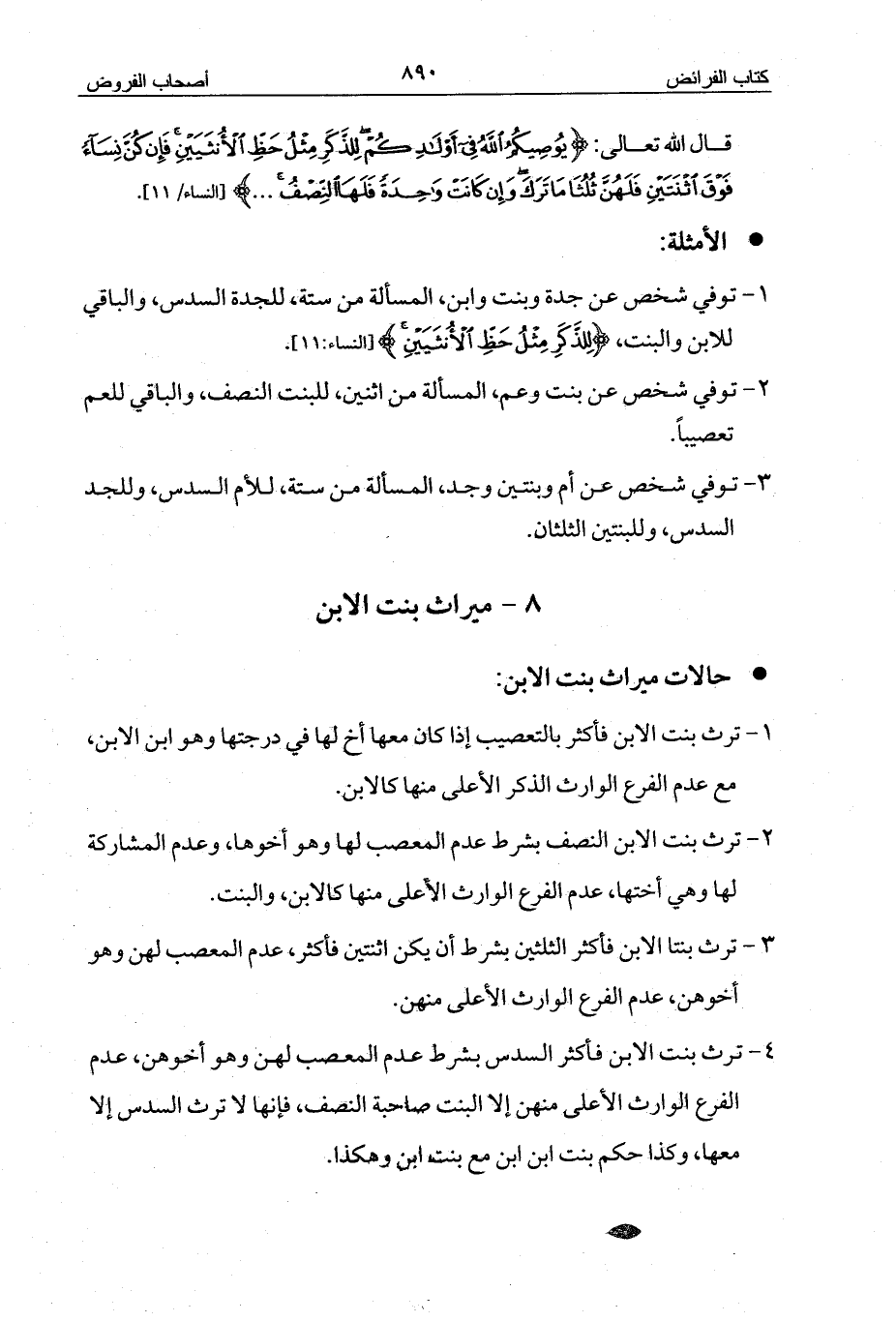 4 - ترث بنت الابن فأكثر السدس بشرط عدم المعصب لهن وهو أخوهن، عدم الفرع الوارث الأعلى منهن إلا البنت صاحبة النصف، فإنها لا ترث السدس إلا معها، وكذا حكم بنت ابن ابن مع بنت ابن وهكذا.