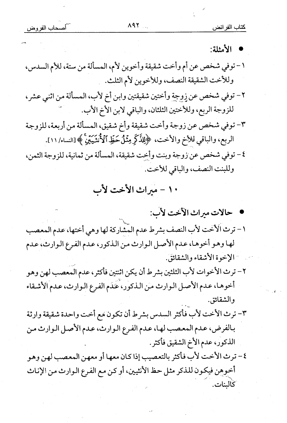 3 - توفي شخص عن زوجة وأخت شقيقة وأخ شقيق، المسألة من أربعة، للزوجة الربع، والباقي للأخ والأخت، {لِلذَّكَرِ مِثْلُ حَظِّ الْأُنْثَيَيْنِ} [النساء/11].