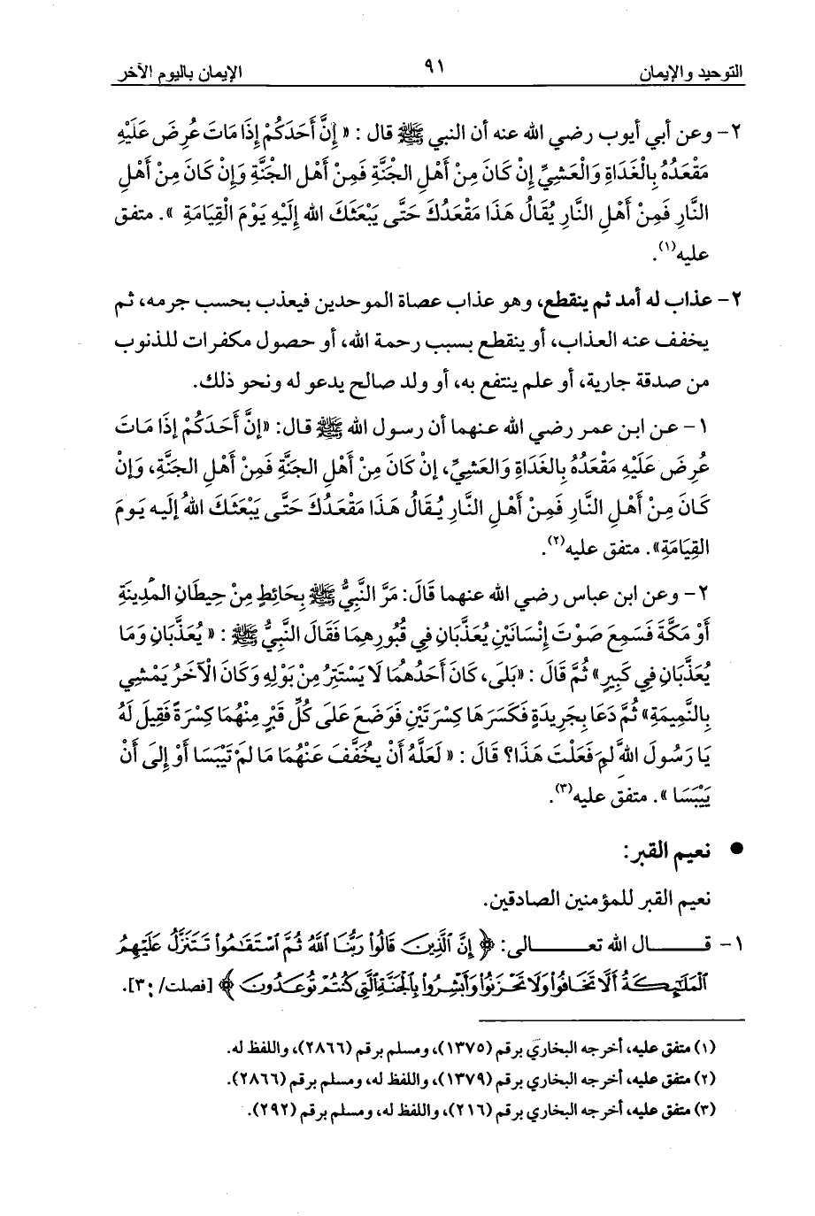 1 - عن ابن عمر رضي الله عنهما أن رسول الله - صلى الله عليه وسلم - قال: «إنَّ أَحَدَكُمْ إذَا مَاتَ عُرِضَ عَلَيْهِ مَقْعَدُهُ بِالغَدَاةِ وَالعَشِيِّ، إنْ كَانَ مِنْ أَهْلِ الجَنَّةِ فَمِنْ أَهْلِ الجَنَّةِ، وَإنْ كَانَ مِنْ أَهْلِ النَّارِ فَمِنْ أَهْلِ النَّارِ يُقَالُ هَذَا مَقْعَدُكَ حَتَّى يَبْعَثَكَ اللهُ إلَيه يَومَ القِيَامَةِ». متفق عليه (¬2).
