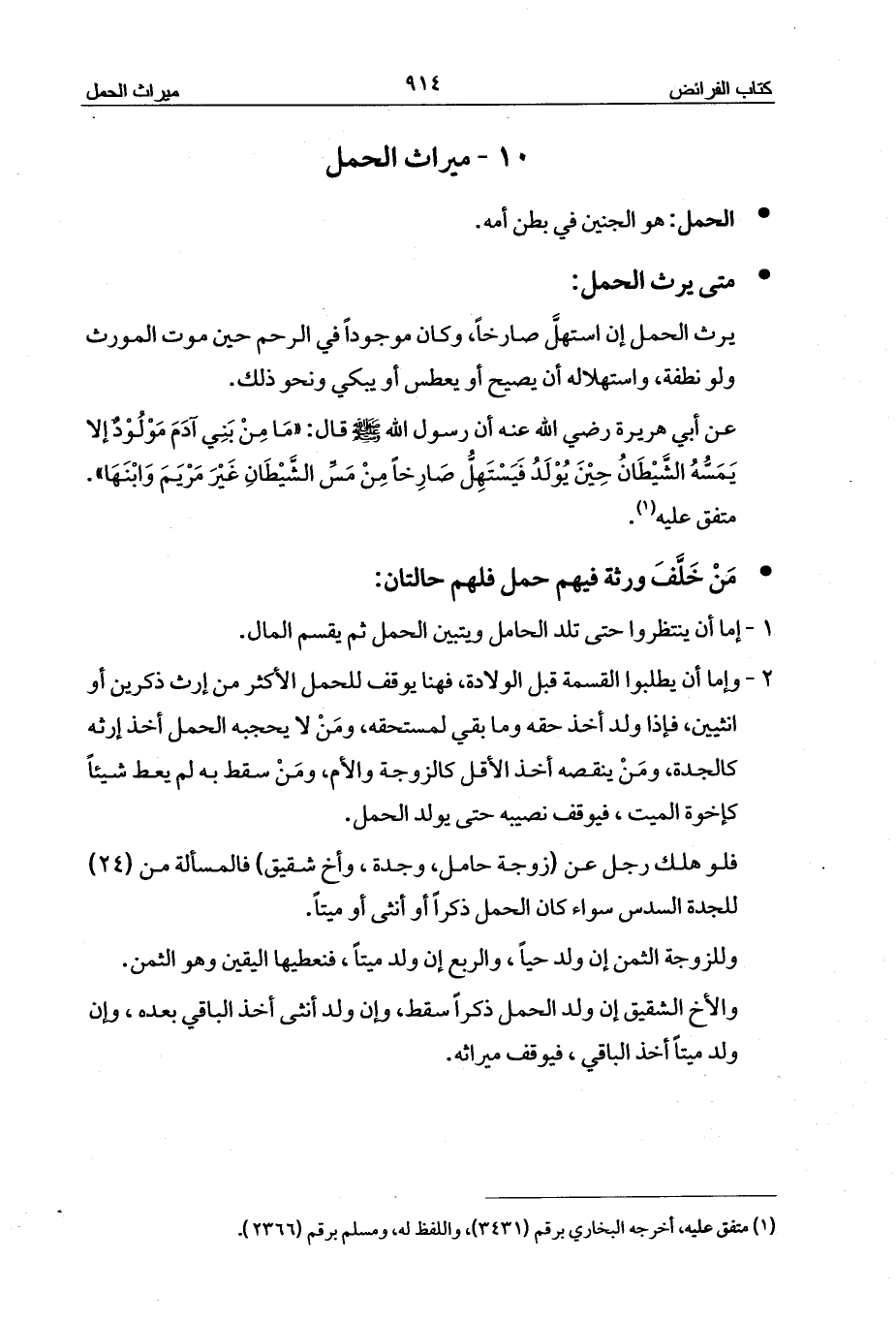 يرث الحمل إن استهلَّ صارخاً، وكان موجوداً في الرحم حين موت المورث ولو نطفة، واستهلاله أن يصيح أو يعطس أو يبكي ونحو ذلك.