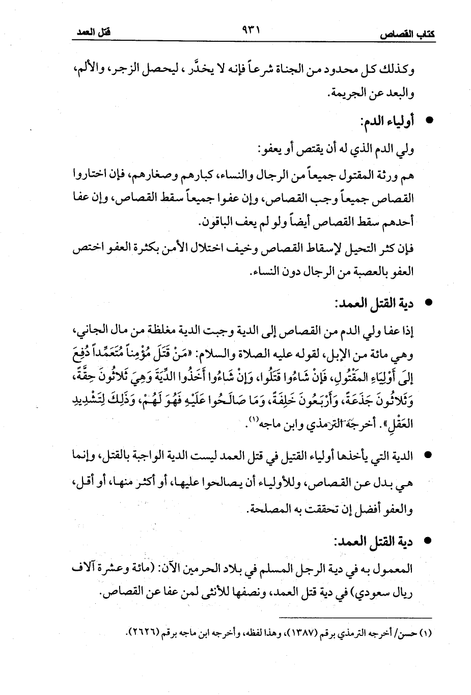 - الدية التي يأخذها أولياء القتيل في قتل العمد ليست الدية الواجبة بالقتل، وإنما هي بدل عن القصاص، وللأولياء أن يصالحوا عليها، أو أكثر منها، أو أقل، والعفو أفضل إن تحققت به المصلحة.