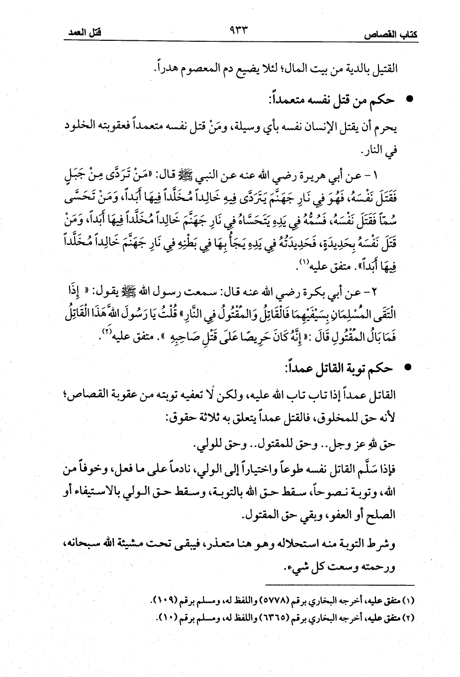 1 - عن أبي هريرة رضي الله عنه عن النبي - صلى الله عليه وسلم - قال: «مَنْ تَرَدَّى مِنْ جَبَلٍ فَقَتَلَ نَفْسَهُ، فَهُوَ فِي نَارِ جَهَنَّمَ يَتَرَدَّى فِيهِ خَالِداً مُخَلَّداً فِيهَا أَبَداً، وَمَنْ تَحَسَّى سُمّاً فَقَتَلَ نَفْسَهُ، فَسُمُّهُ فِي يَدِهِ يَتَحَسَّاهُ فِي نَارِ جَهَنَّمَ خَالِداً مُخَلَّداً فِيهَا أَبَداً، وَمَنْ قَتَلَ نَفْسَهُ بِحَدِيدَةٍ، فَحَدِيدَتُهُ فِي يَدِهِ يَجَأُ بِهَا فِي بَطْنِهِ فِي نَارِ جَهَنَّمَ خَالِداً مُخَلَّداً فِيهَا أَبَداً». متفق عليه (¬1).