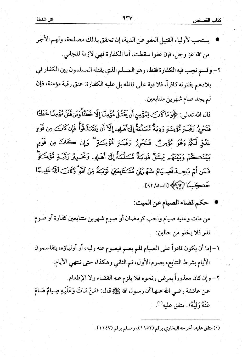 قال الله تعالى: {وَمَا كَانَ لِمُؤْمِنٍ أَنْ يَقْتُلَ مُؤْمِنًا إِلَّا خَطَأً وَمَنْ قَتَلَ مُؤْمِنًا خَطَأً فَتَحْرِيرُ رَقَبَةٍ مُؤْمِنَةٍ وَدِيَةٌ مُسَلَّمَةٌ إِلَى أَهْلِهِ إِلَّا أَنْ يَصَّدَّقُوا فَإِنْ كَانَ مِنْ قَوْمٍ عَدُوٍّ لَكُمْ وَهُوَ مُؤْمِنٌ فَتَحْرِيرُ رَقَبَةٍ مُؤْمِنَةٍ وَإِنْ كَانَ مِنْ قَوْمٍ بَيْنَكُمْ وَبَيْنَهُمْ مِيثَاقٌ فَدِيَةٌ مُسَلَّمَةٌ إِلَى أَهْلِهِ وَتَحْرِيرُ رَقَبَةٍ مُؤْمِنَةٍ فَمَنْ لَمْ يَجِدْ فَصِيَامُ شَهْرَيْنِ مُتَتَابِعَيْنِ تَوْبَةً مِنَ اللَّهِ وَكَانَ اللَّهُ عَلِيمًا حَكِيمًا (92)} [النساء/92].