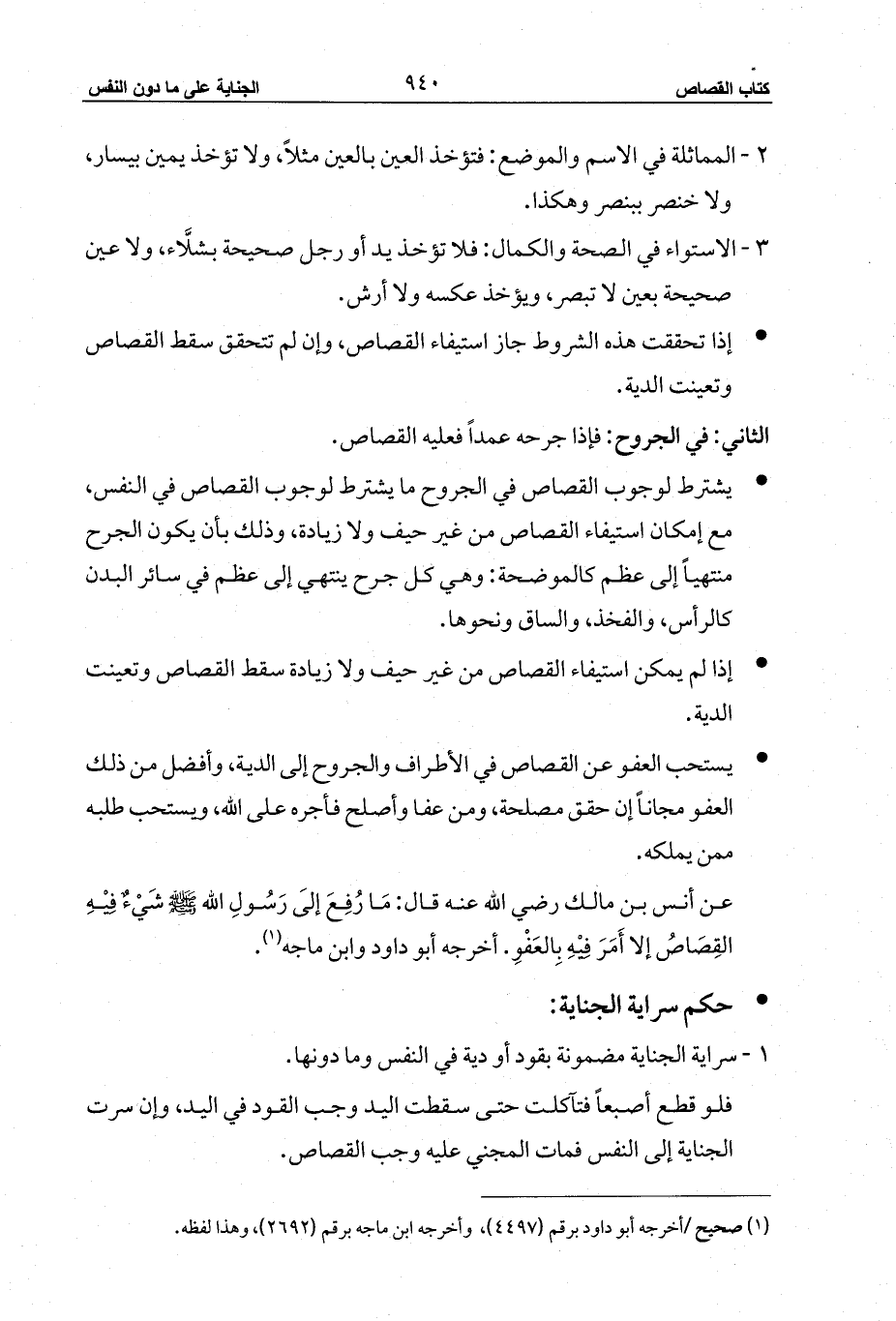 - يستحب العفو عن القصاص في الأطراف والجروح إلى الدية، وأفضل من ذلك العفو مجاناً إن حقق مصلحة، ومن عفا وأصلح فأجره على الله، ويستحب طلبه ممن يملكه.