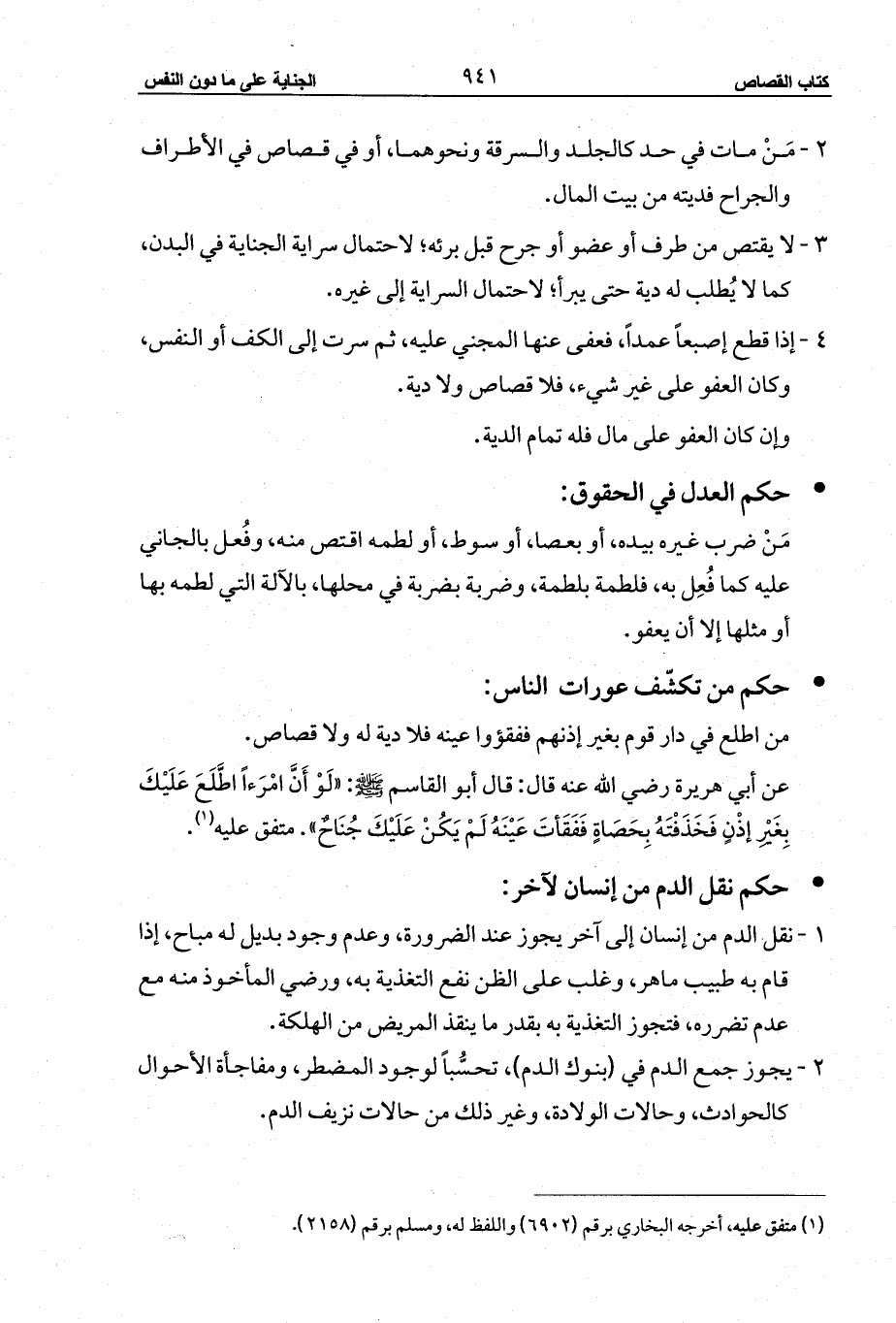 عن أبي هريرة رضي الله عنه قال: قال أبو القاسم - صلى الله عليه وسلم -: «لَوْ أَنَّ امْرَءاً اطَّلَعَ عَلَيْكَ بِغَيْرِ إذْنٍ فَخَذَفْتَهُ بِحَصَاةٍ فَفَقَأتَ عَيْنَهُ لَمْ يَكُنْ عَلَيْكَ جُنَاحٌ». متفق عليه (¬1).
